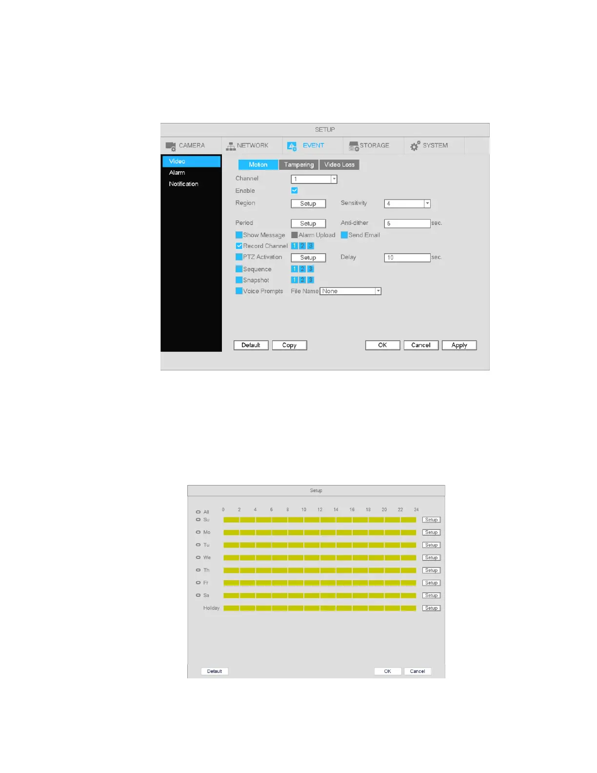a) Go to Main Menu->Setup->Event->Video->Motion. See Figure 4-35.