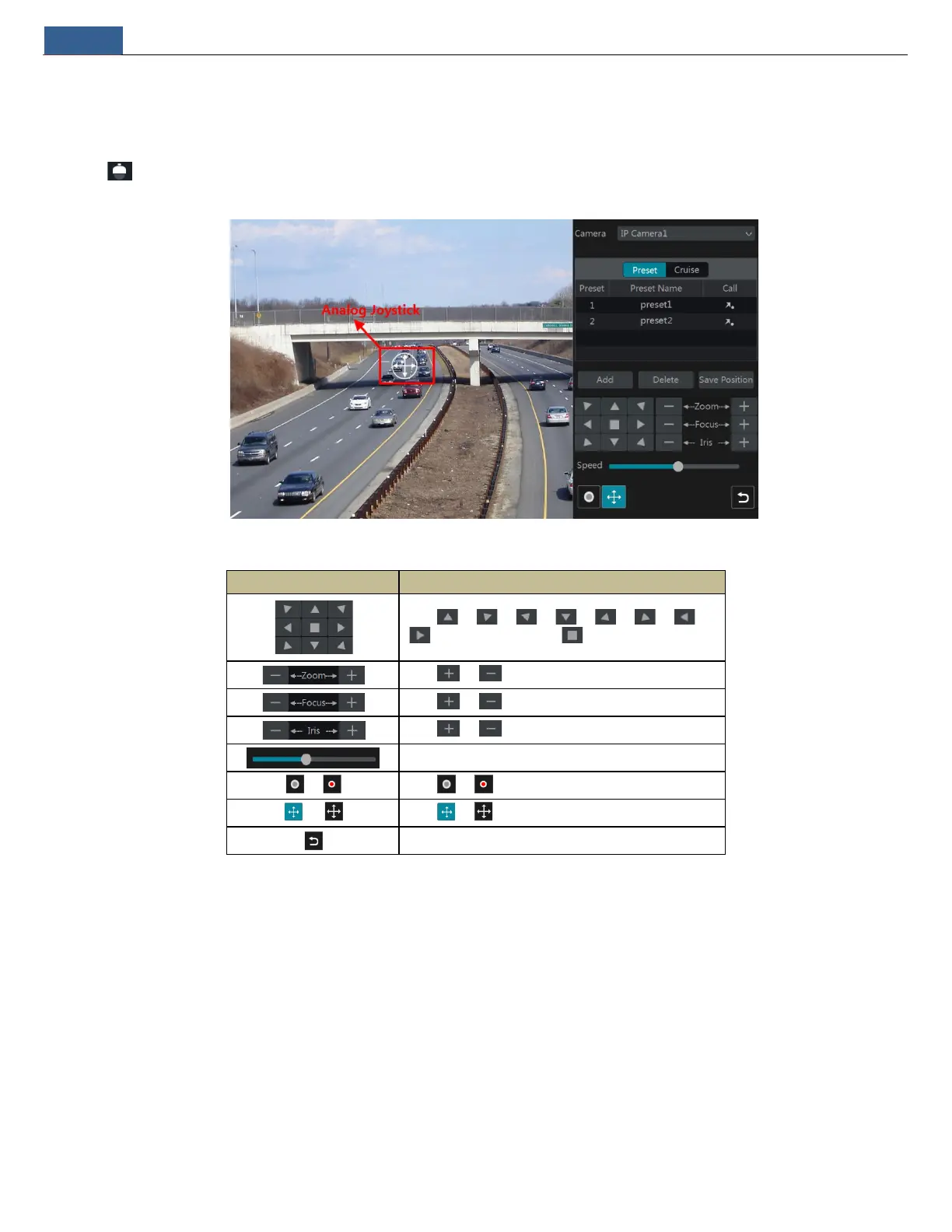 The analog joystick on the left side of the interface provides quick PTZ control. The dome or PTZ will rotate when you drag the analog joystick. The