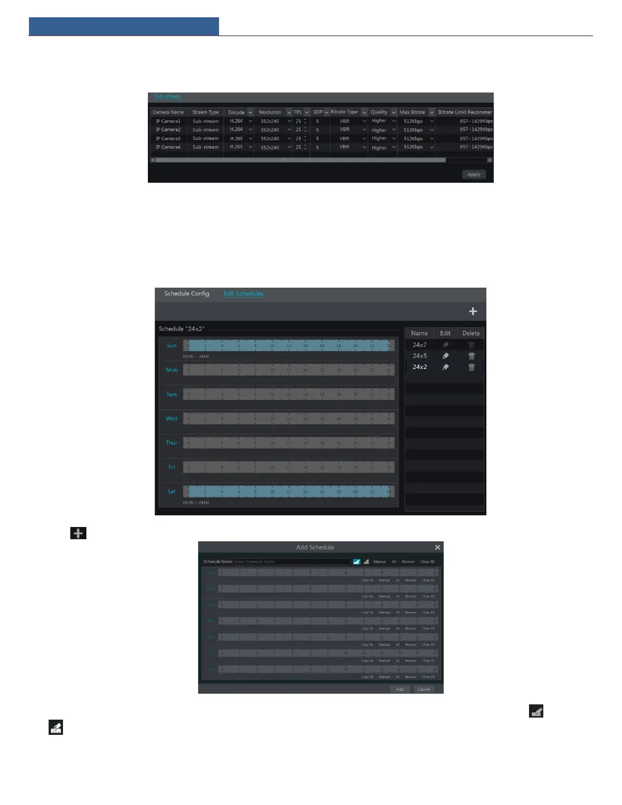 Click StartSettingsRecordRecord ScheduleEdit Schedules to go to the interface as shown below. “24ⅹ7”, “24ⅹ5” and “24ⅹ2” are the default