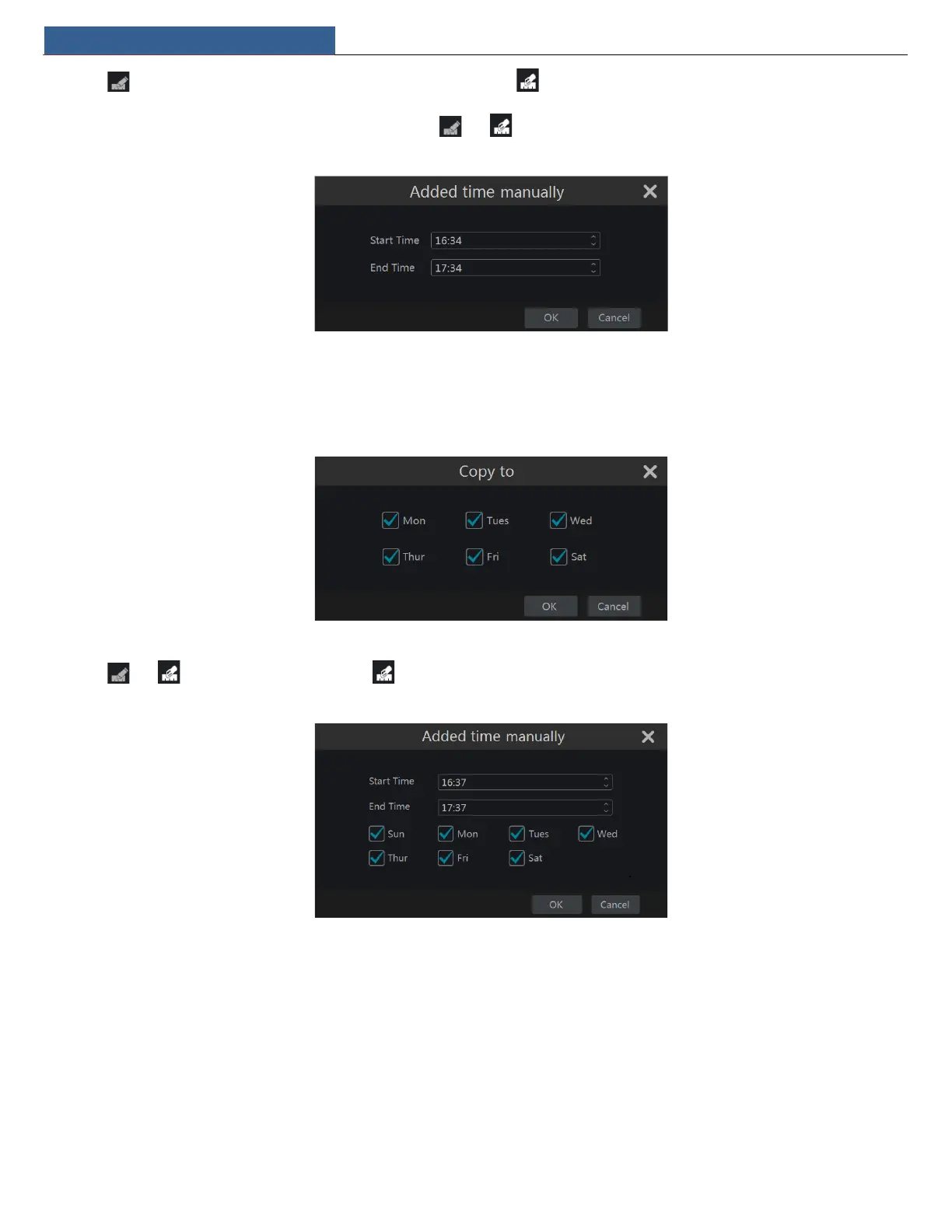 You can manually set the record start time and end time. Click or and then click “Manual” on each day to pop up a window as shown