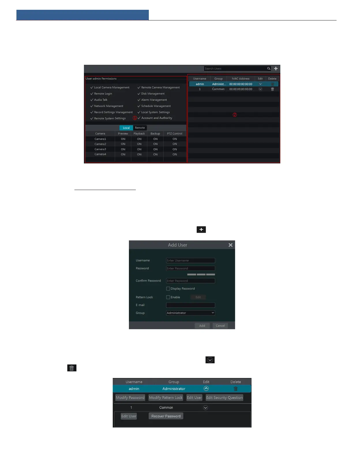 ② Set the username, password and group. User can also set the pattern lock here. The e-mail address is optional. Click “Add” to add the user.