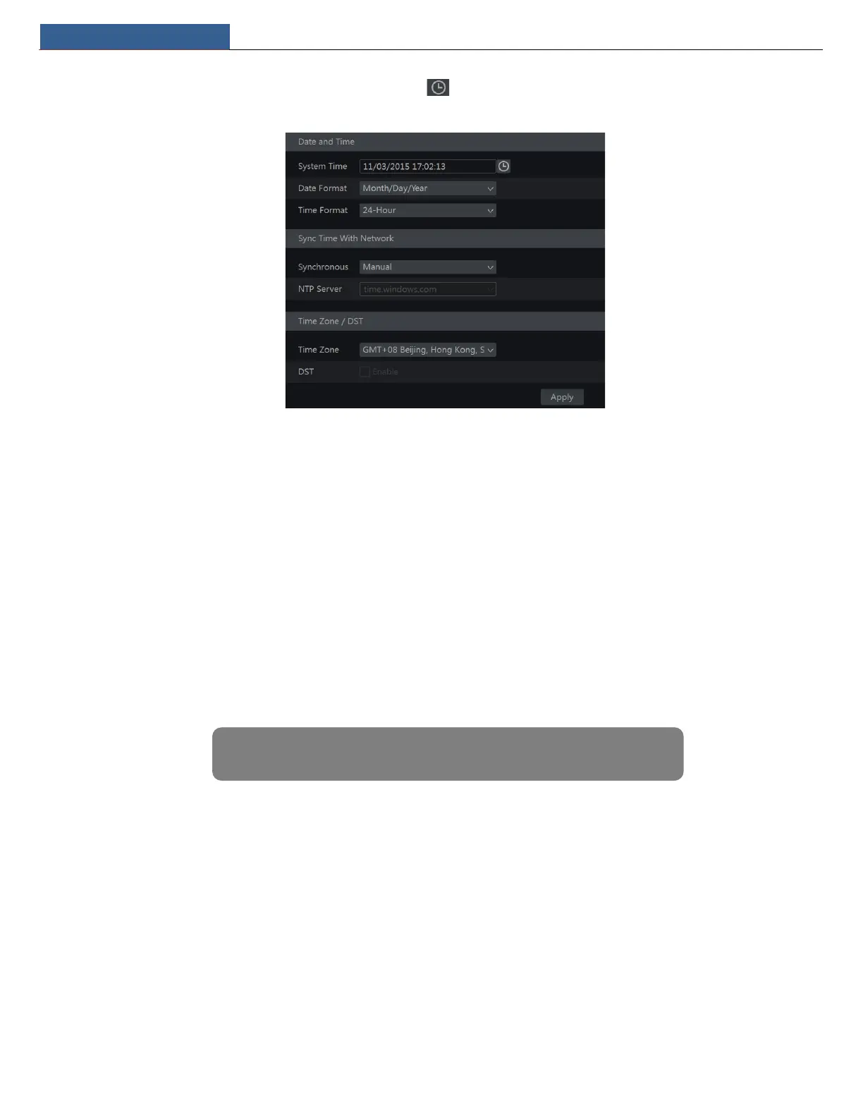 Manual: select “Manual” in the “Synchronous” option and then click after the “System Time” option to set the system time.
