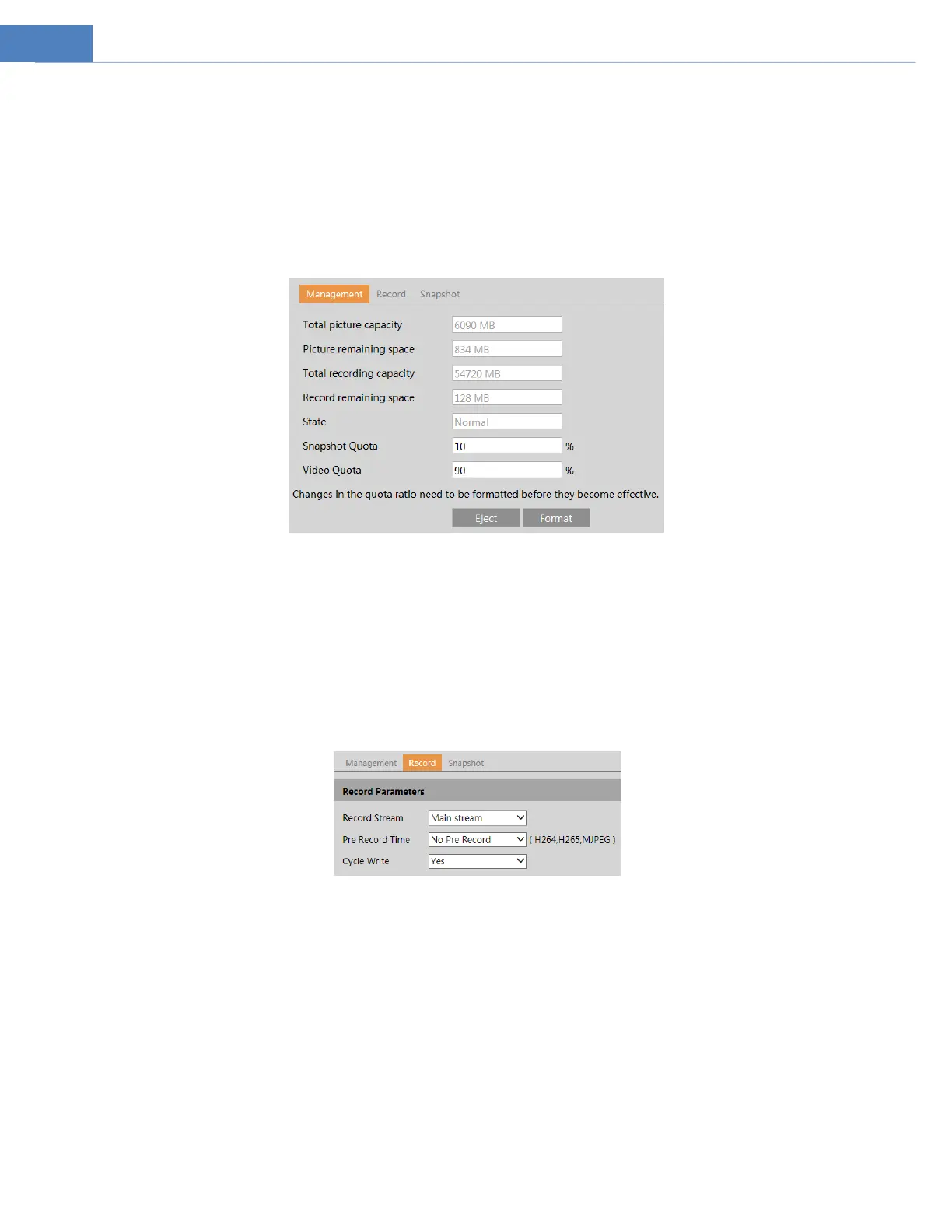 Snapshot Quota: Set the capacity proportion of captured pictures on the SD card.