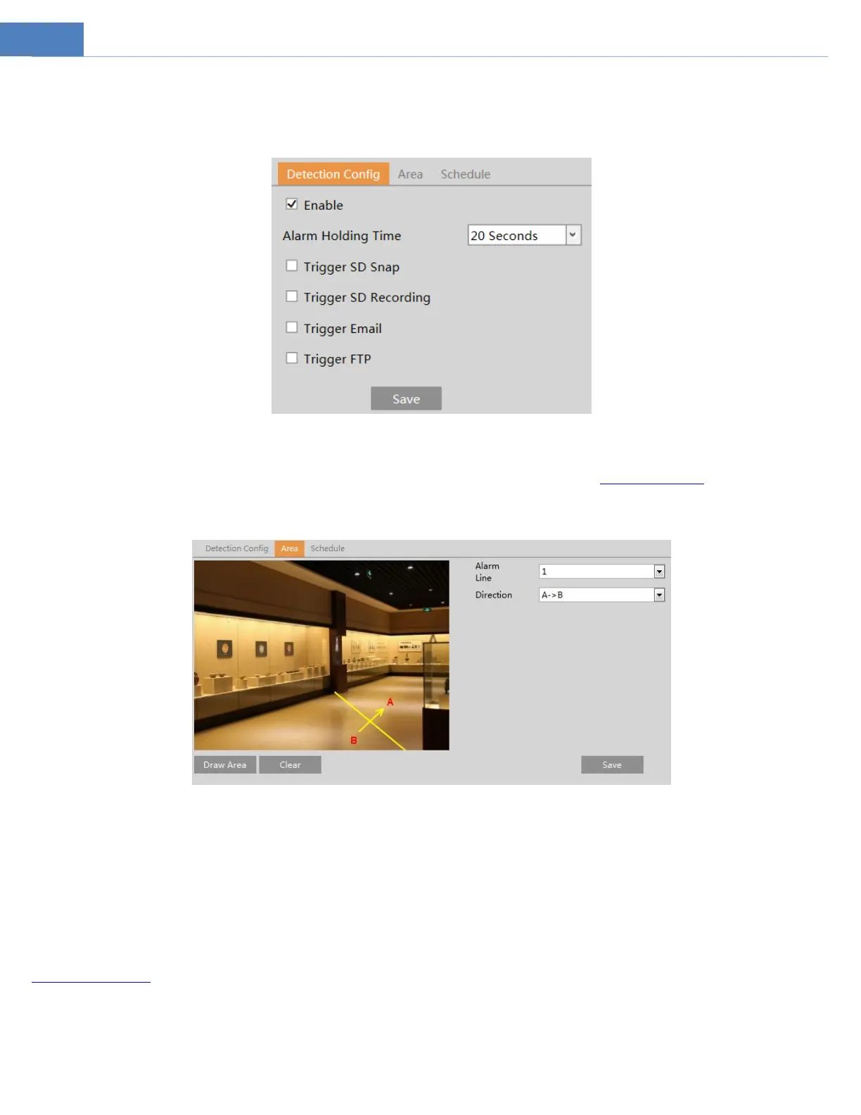 Line Crossing: Alarms will be triggered if the target crosses the defined alarm lines.