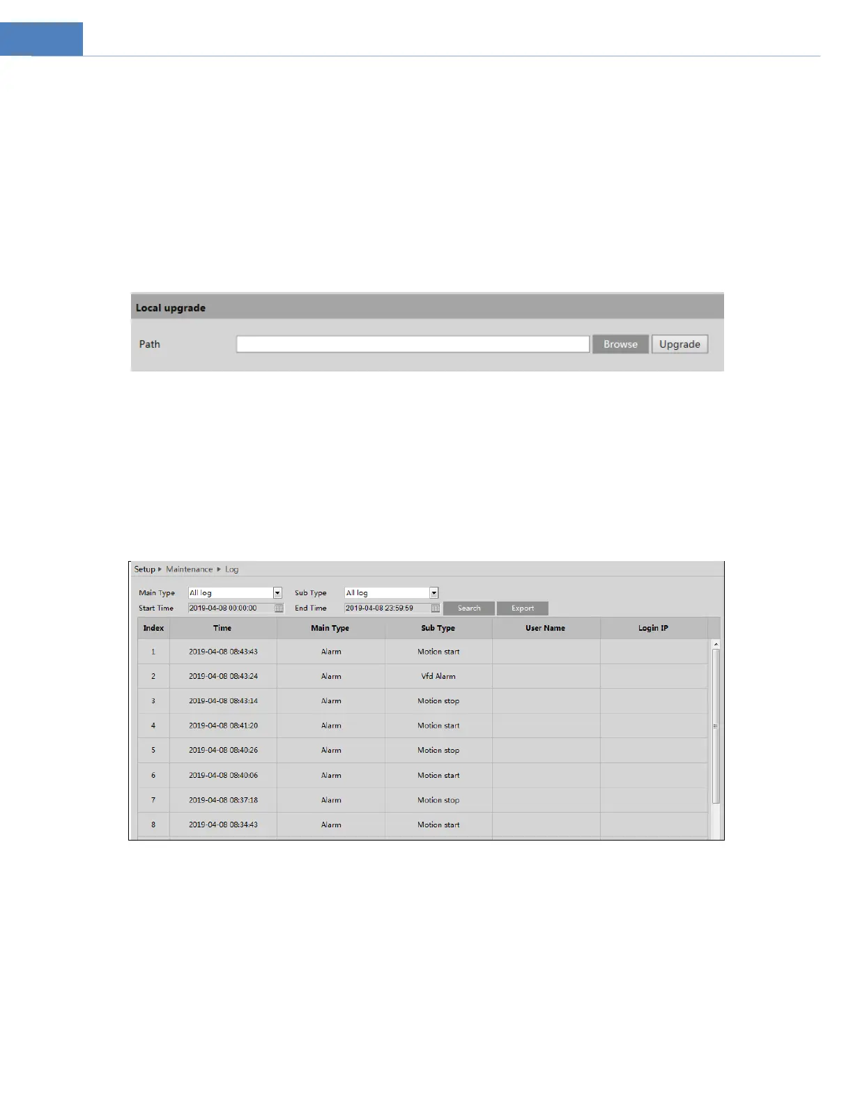 Go to MaintenanceUpgrade. In this interface, the camera firmware can be updated.