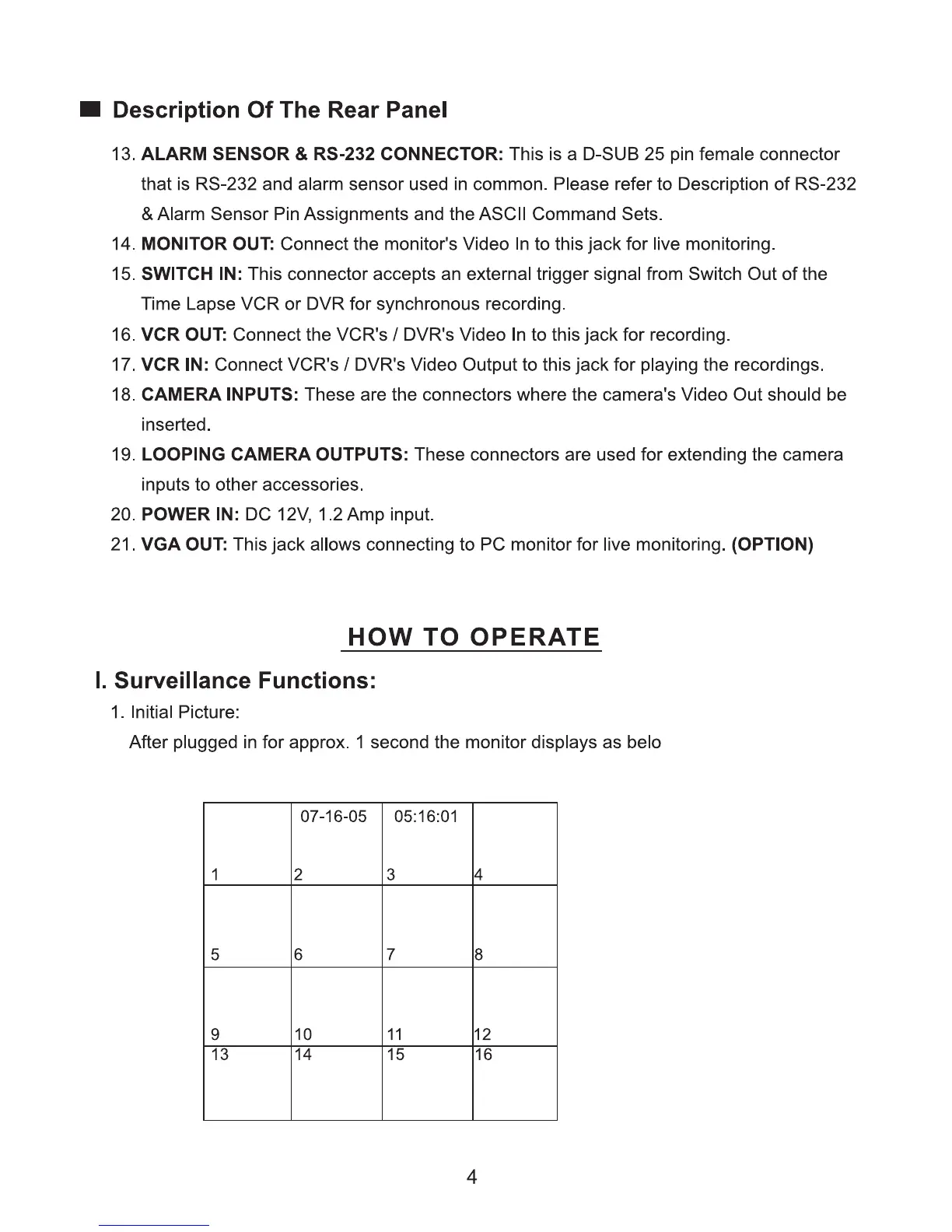 Speco RMX-9CD - How to Operate; Description of the Rear Panel; Surveillance Functions