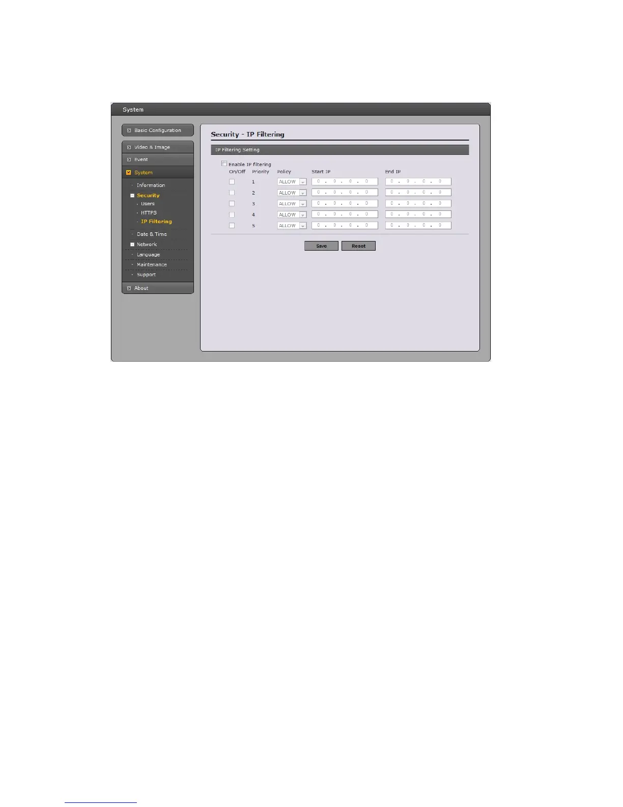 le IP address filtering box enables the IP address filtering function. Up to 256 IP