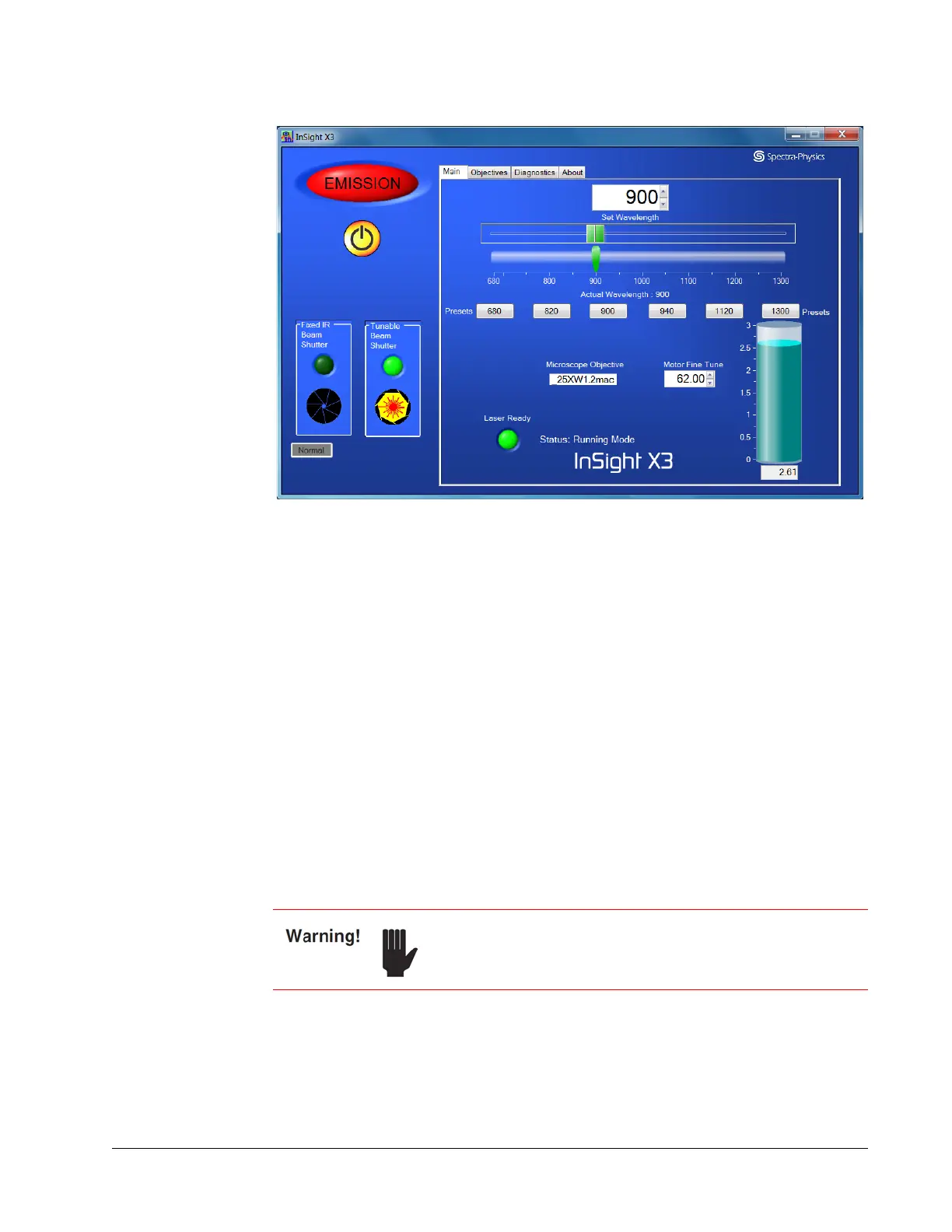 Figure 6-5 Main tab display showing laser on and shutter open