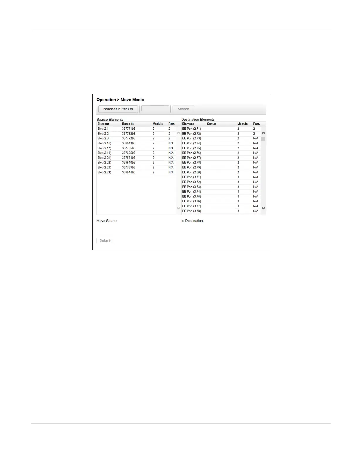 • Source Elements - Tape drives, enabled EE ports, and storage slots that contain a