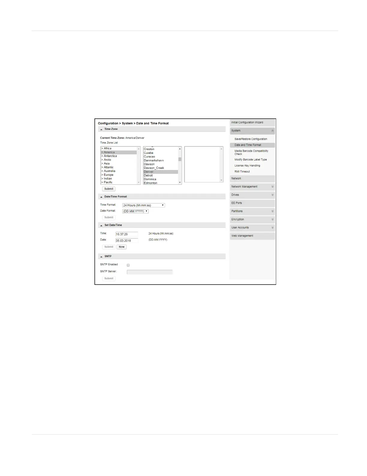 server from the Configuration > System > Date and Time Format screen.