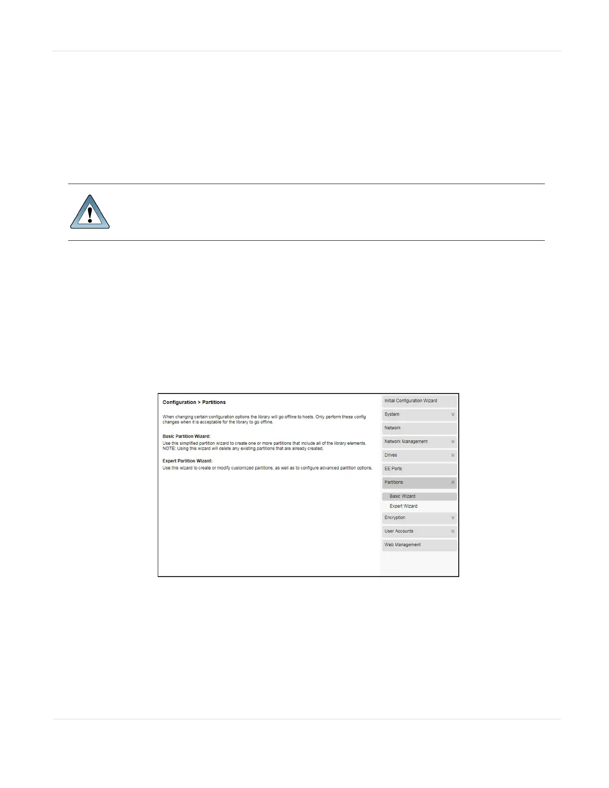 1. From the home screen of the library interface, select Configuration > Partitions.