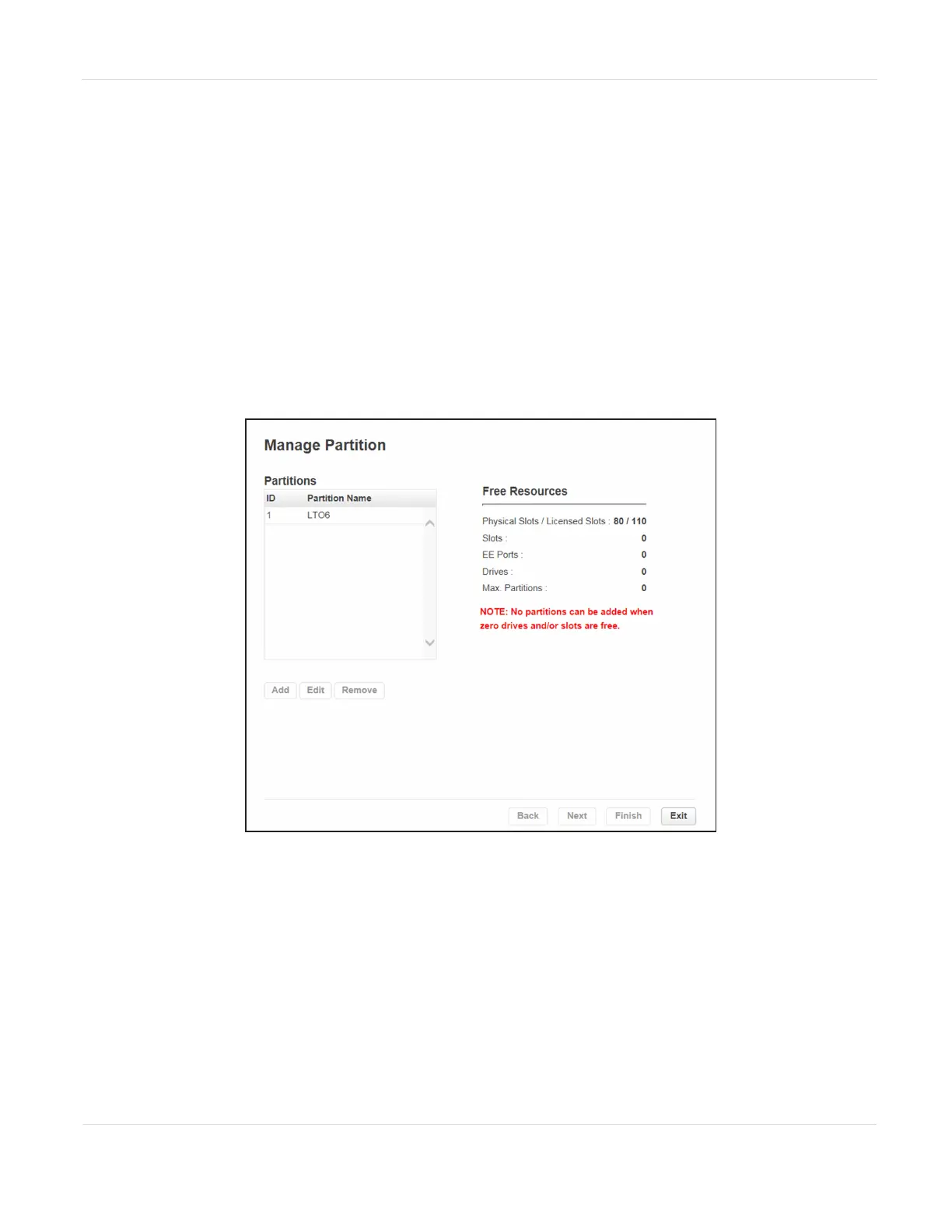 Partitions screen lists the current partitions, if any, and the free resources. Use this