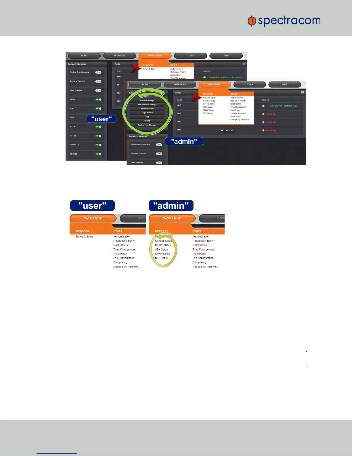 "user" and "admin" accounts can view and modify all settings in these pages (can view/edit