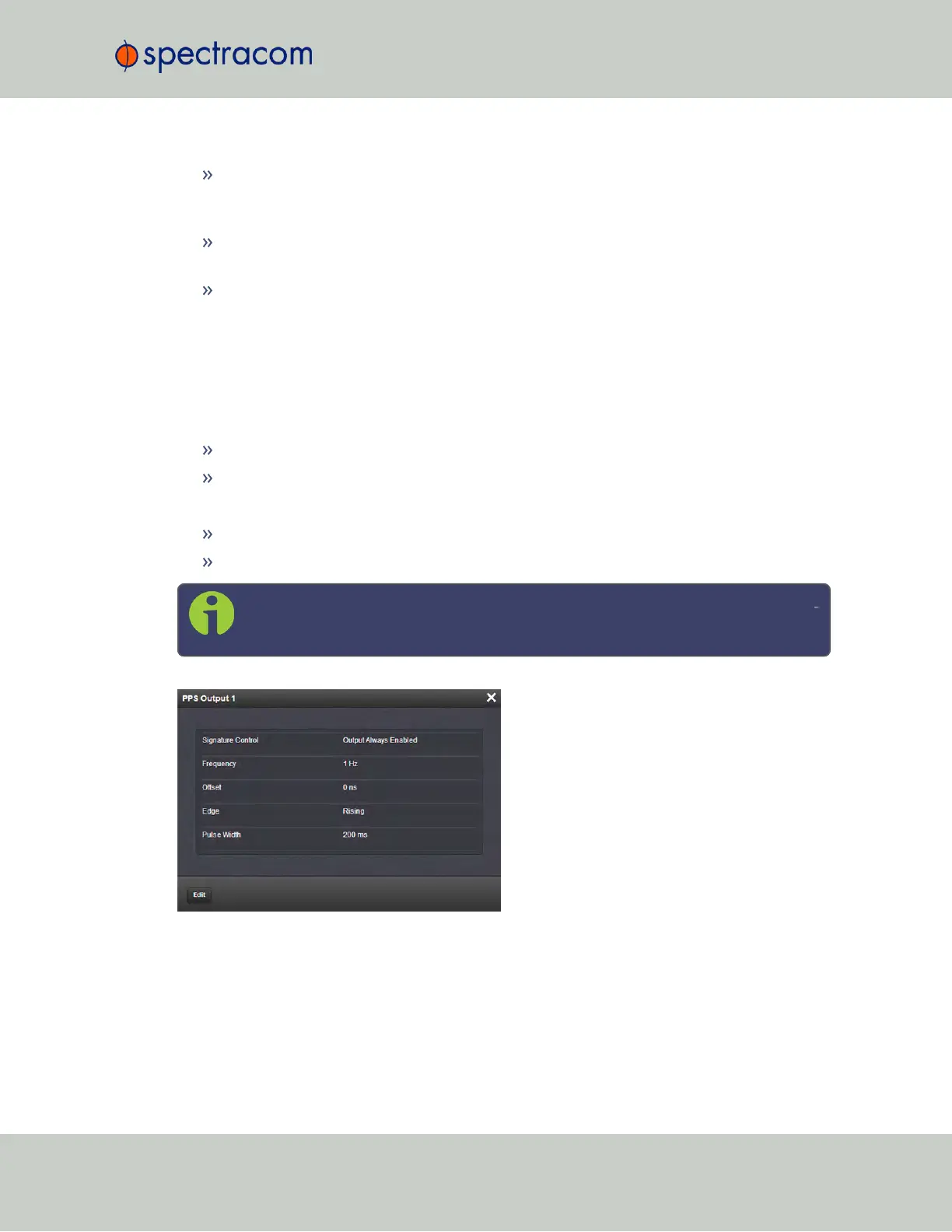 To view the current settings of a 1PPS output, go to its Status window. For instructions, see: