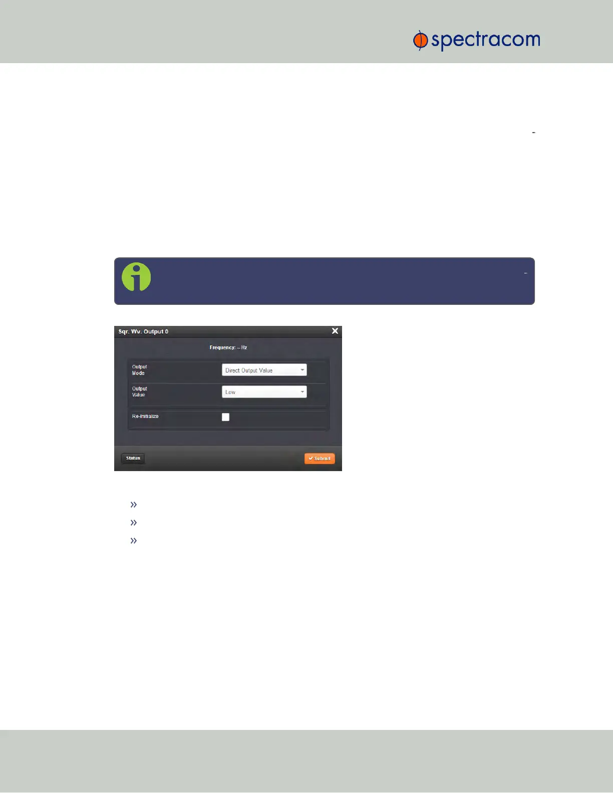 To view the current settings of a Square Wave Output, go to its Status window. For instructions,