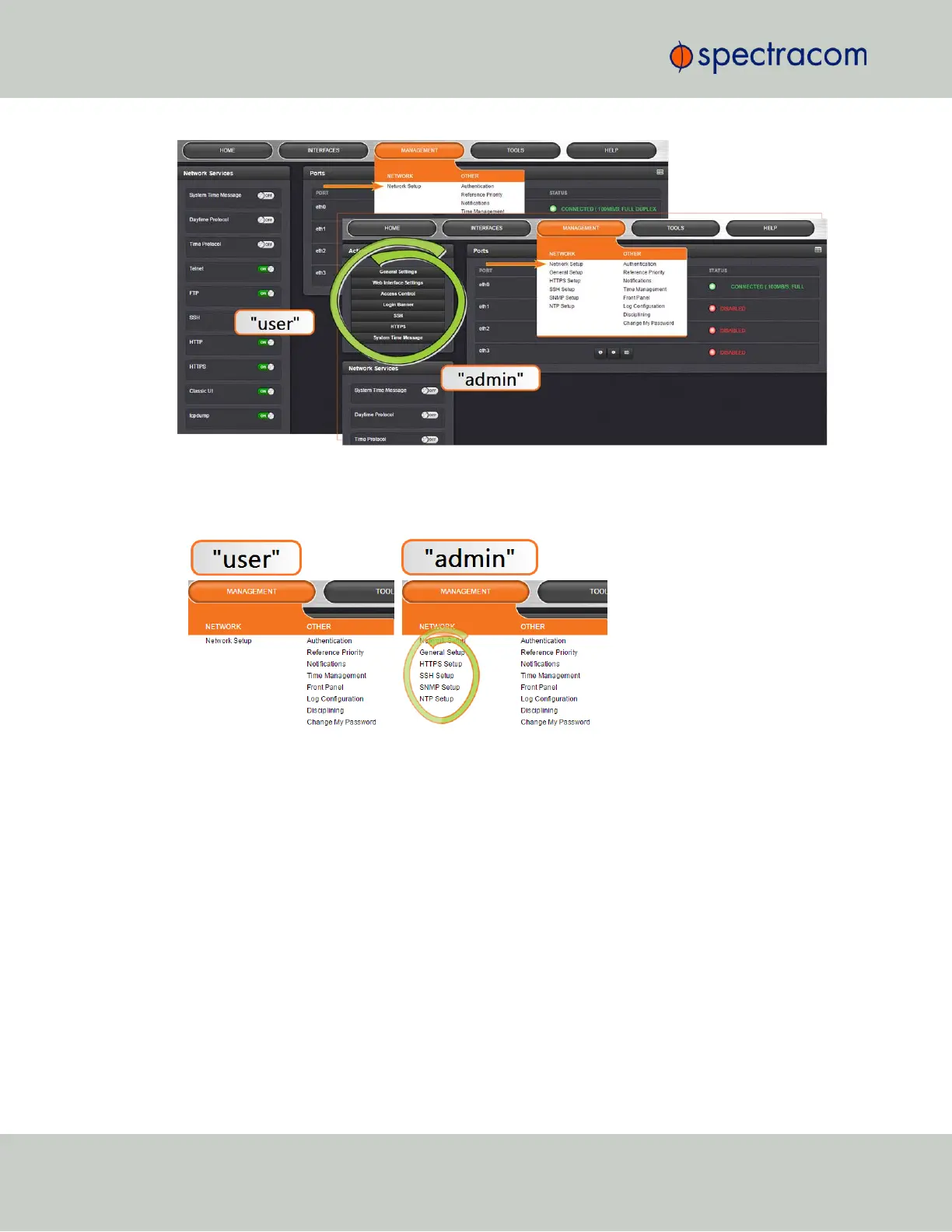 "user" and "admin" accounts can view and modify all settings in these pages (can view/edit