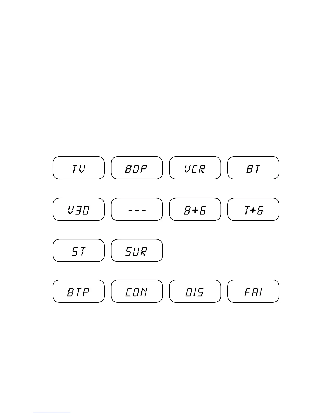 The possible readouts and their meanings are shown below. The red LED indicates that the sound system is on Standby Mode.