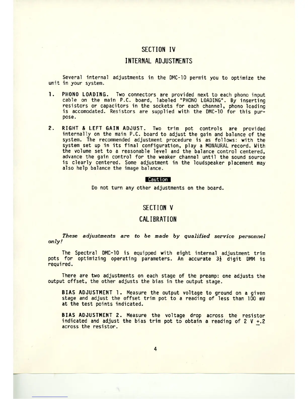 Spectral DMC-10 - Section IV: Internal Adjustments; Phono Loading and Gain Configuration; Section V: Calibration; Output Offset and Bias Calibration