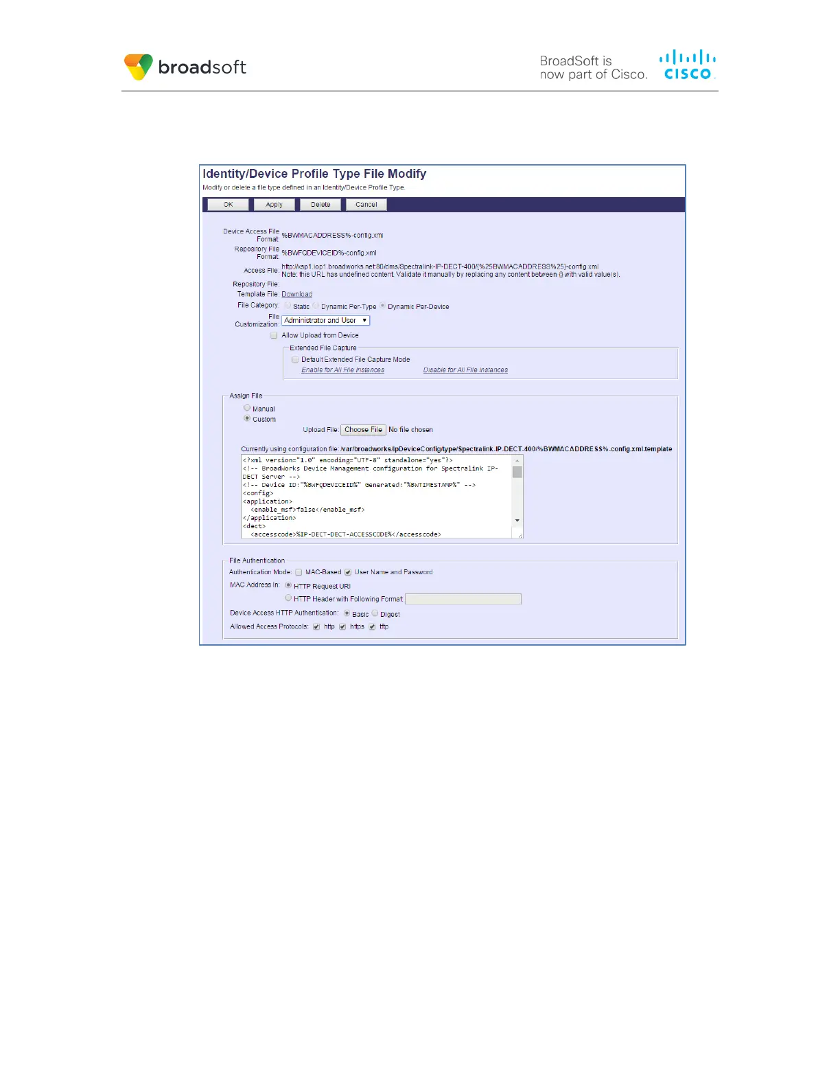 After creating the device profile type file, upload %BWMACADDRESS%-config.xml, which