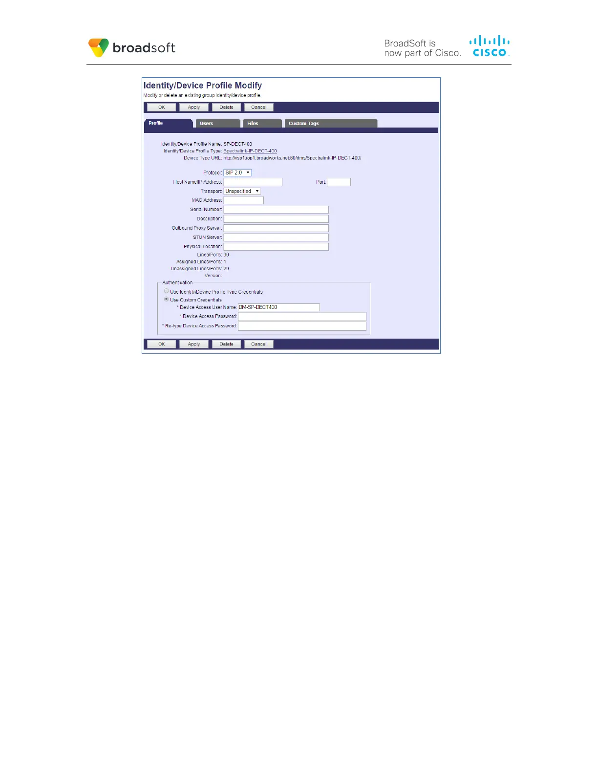 The device profile created in the previous section must be assigned to the BroadWorks