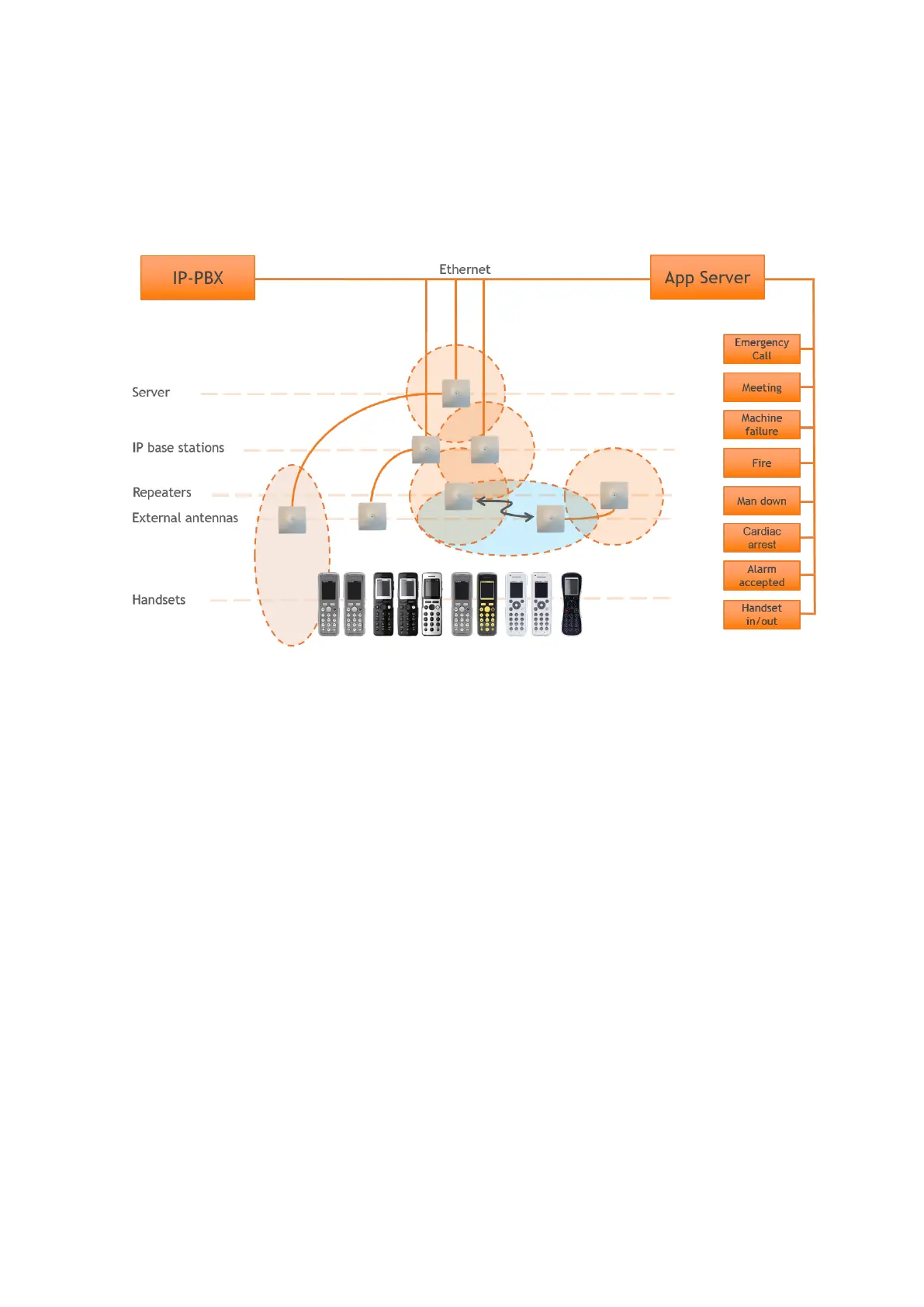 Optional wireless repeaters can be used to extend the coverage of the Spectralink IP-DECT Base