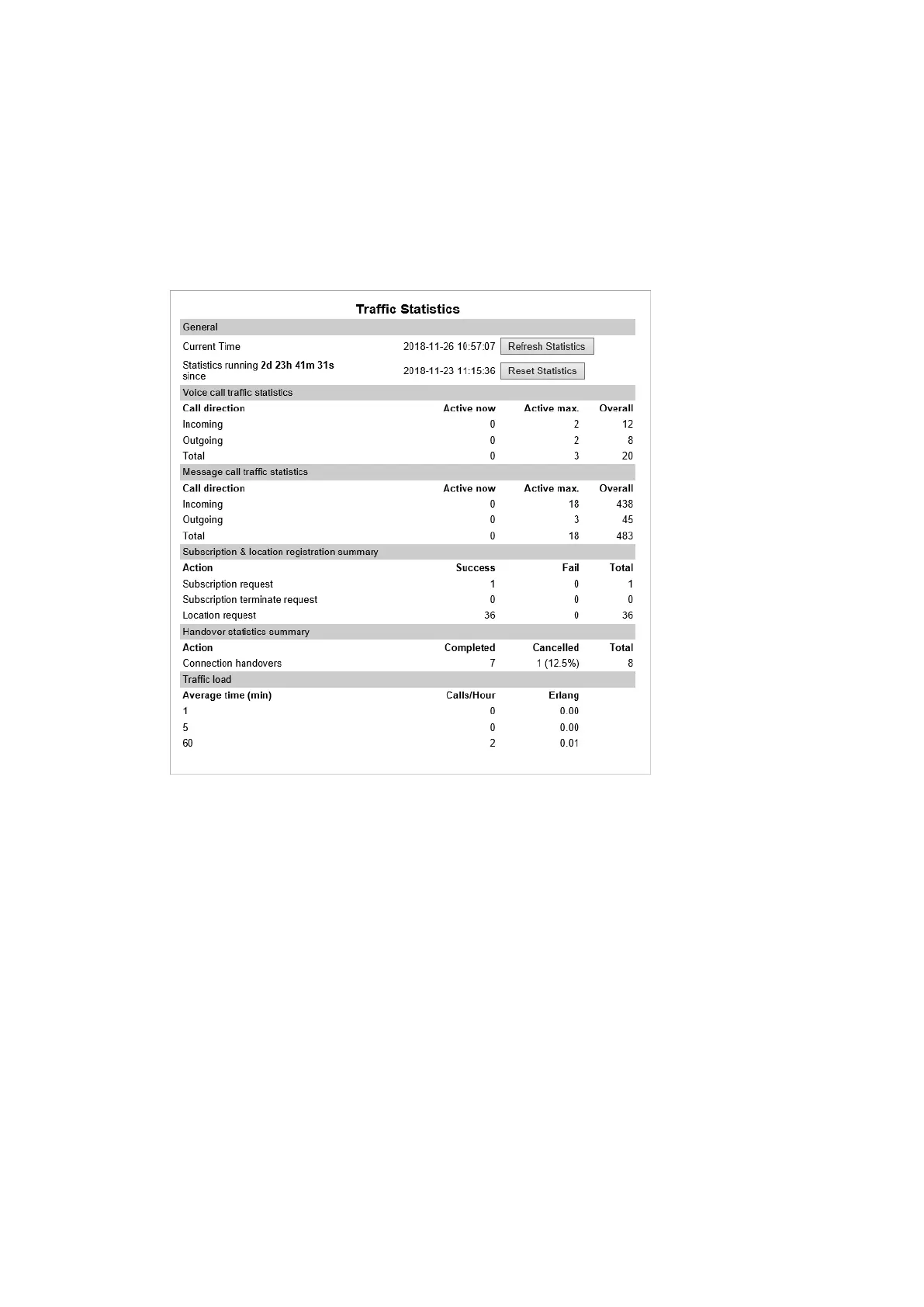 and handover statistics. It also provides information about the traffic load (Erlang) of the installation