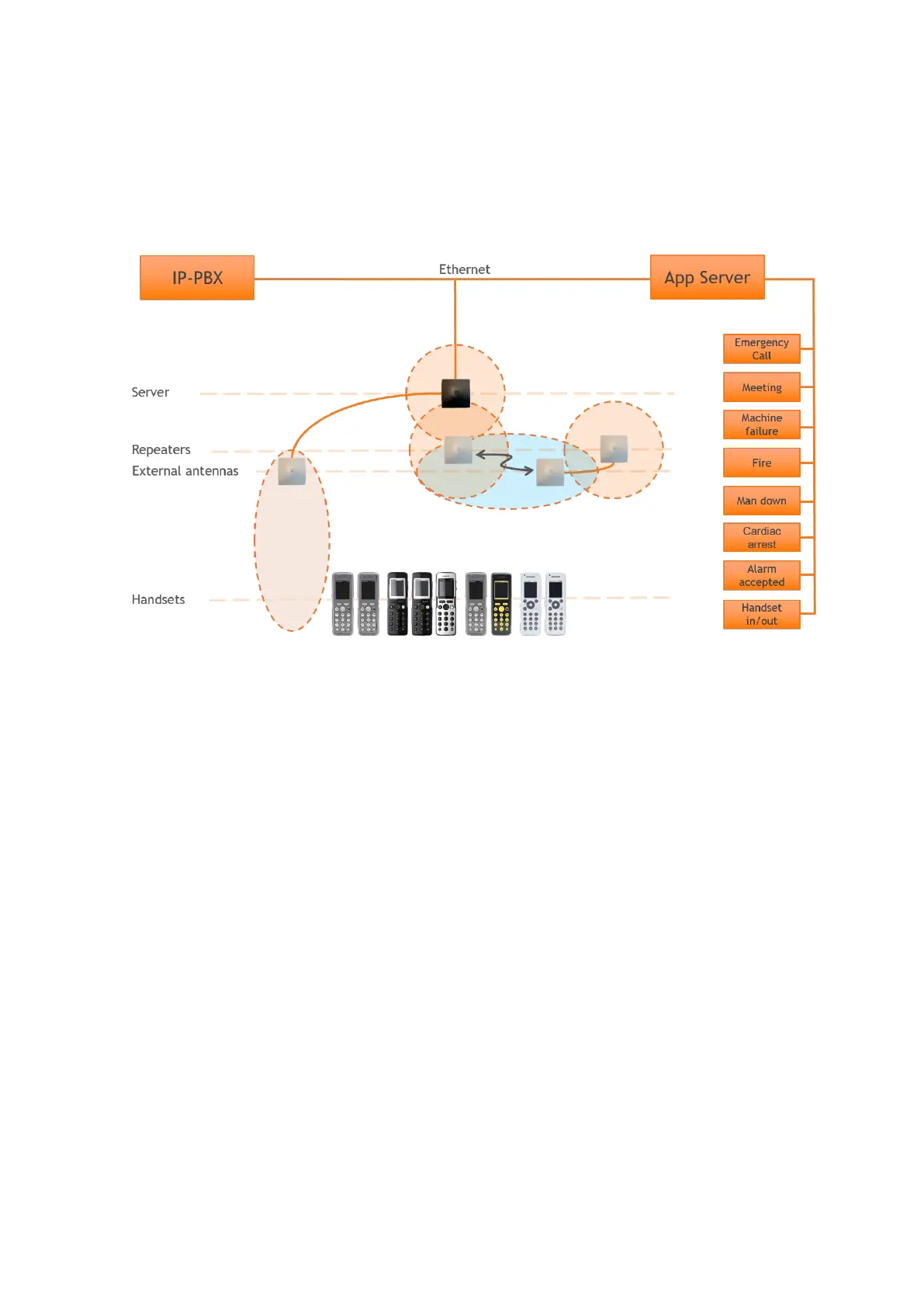 Optional wireless repeaters can be used to extend the coverage of the Spectralink IP-DECT Server