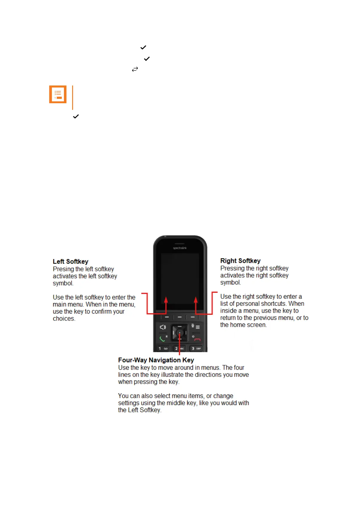 You navigate the handset using two softkeys and a four-way navigation key. The following
