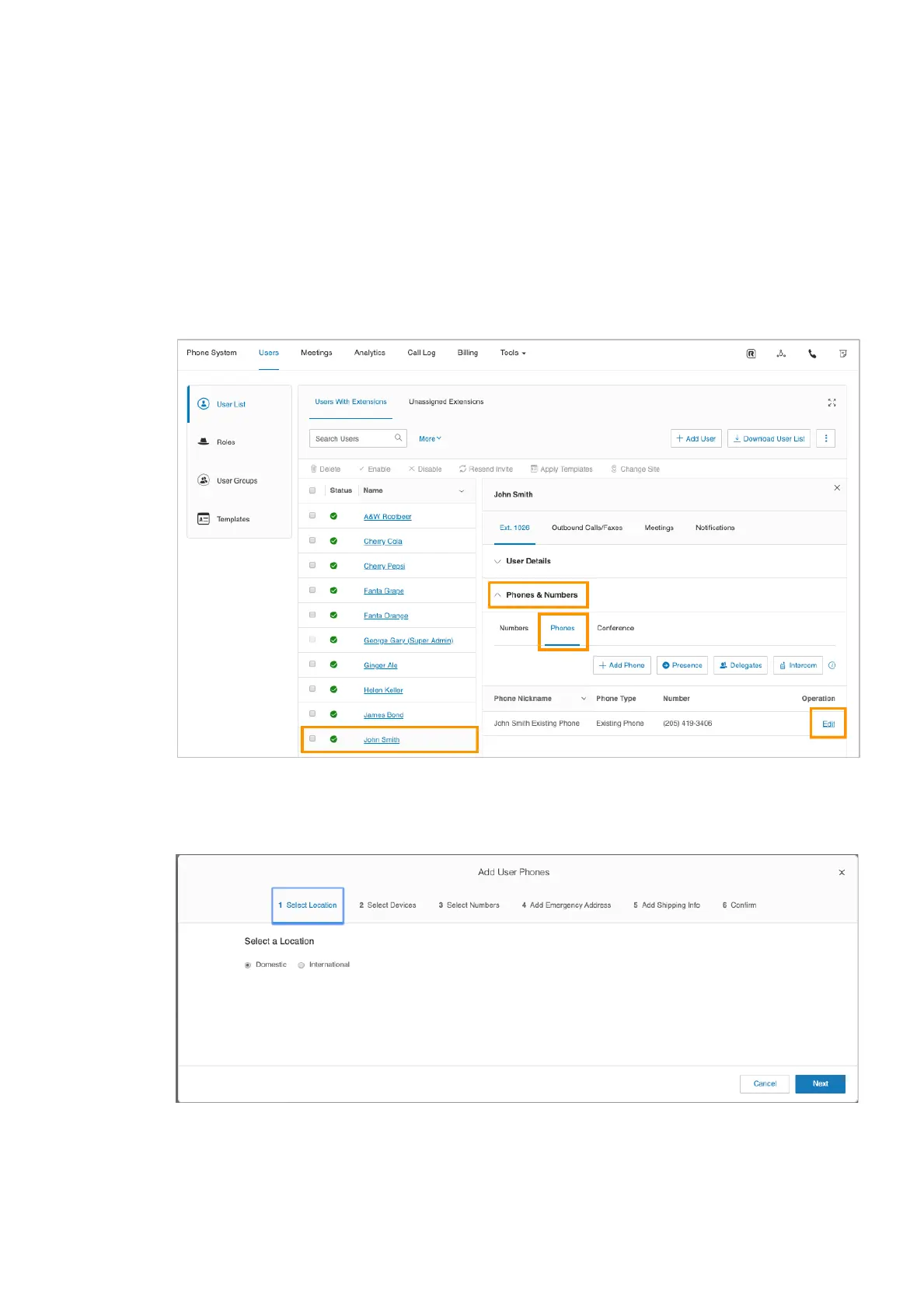 ○ Expand the user’s Phones & Number section, click Phones, and then click Add