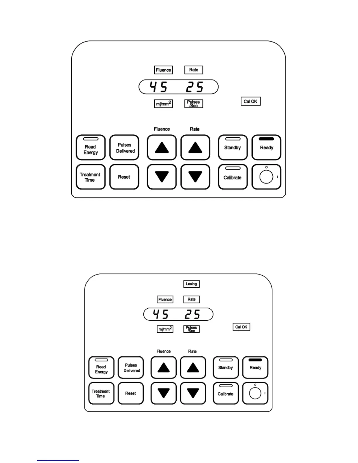 5. Depressing the footswitch causes the red Lasing light and red status light on the top of
