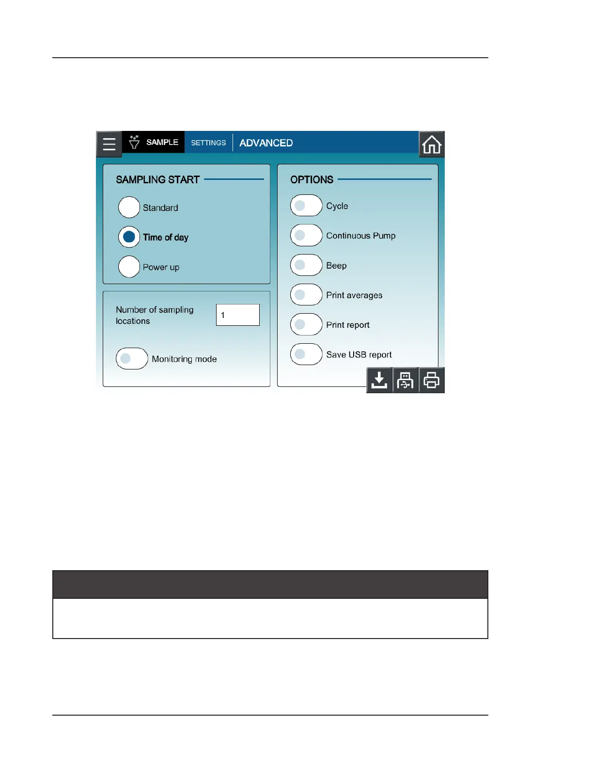 • Time of day: Sampling will automatically start based on the user-configured time.
