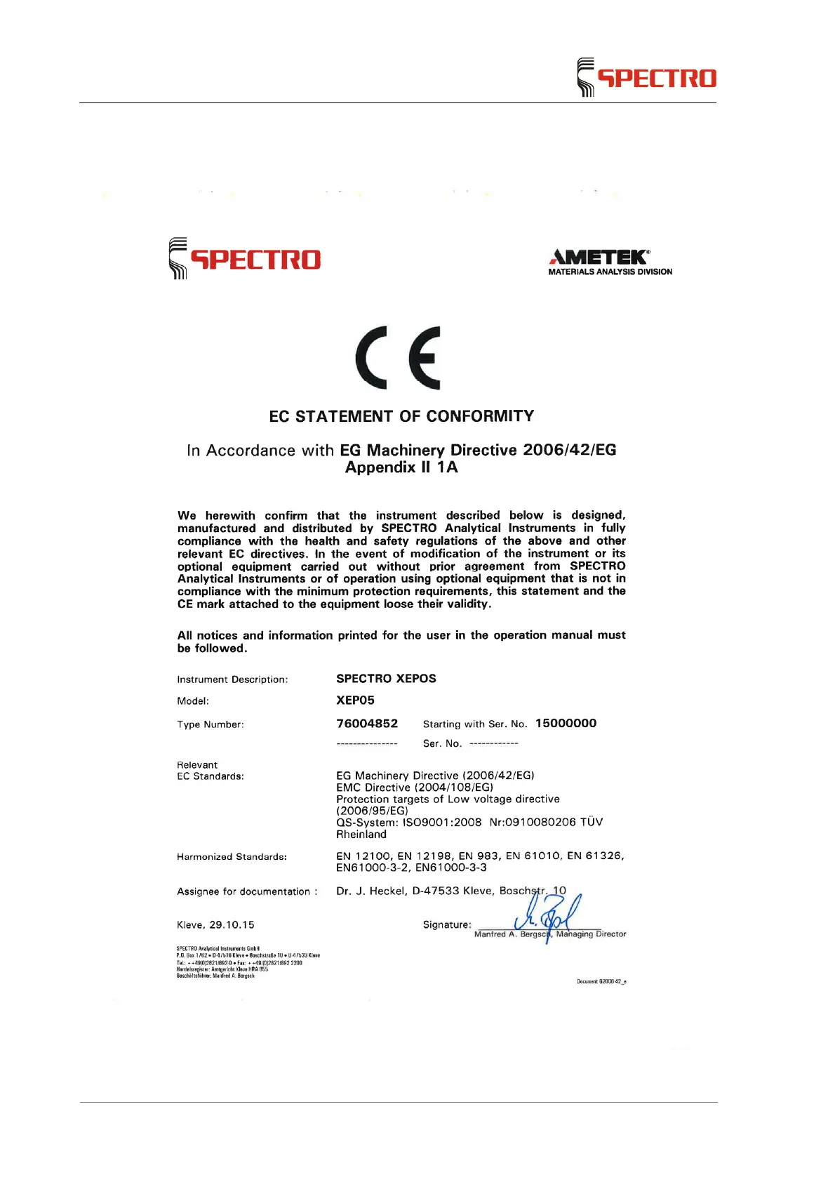 SPECTRO XEP05 - 10 EC Declaration of Conformity