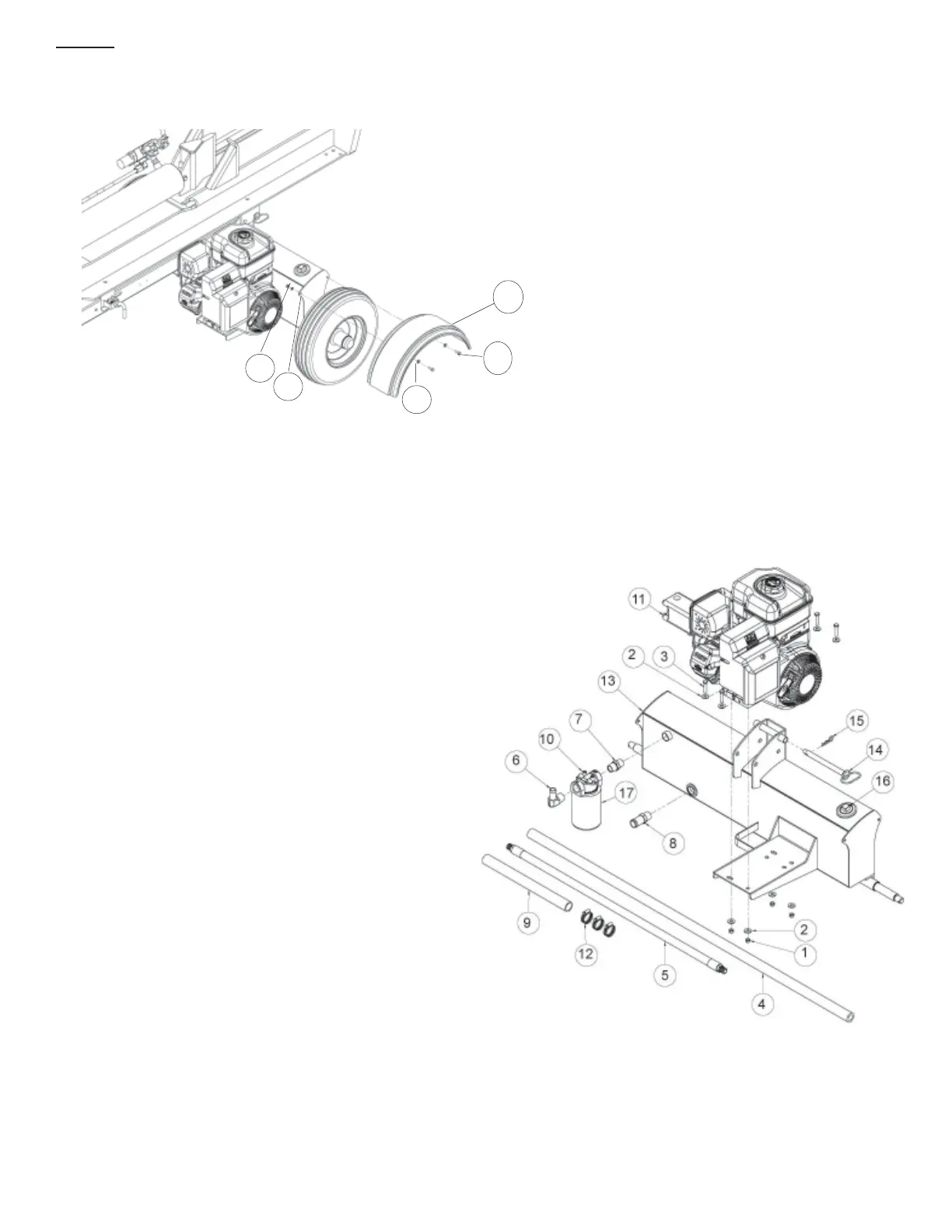 STEP 8: Attach the two fenders (1) to the tank/axle using the four 1/4” NC x 3/4” hex cap bolts (2), the four 1/4” flat