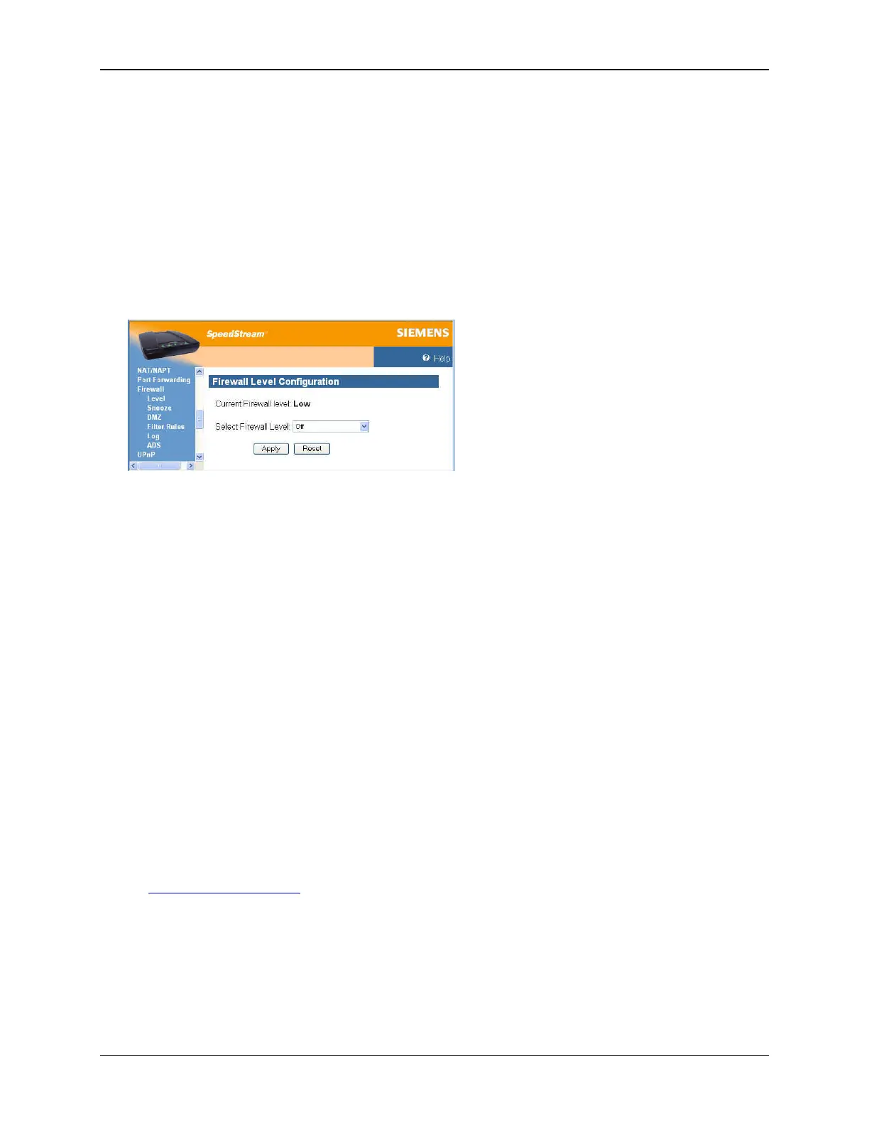 1. Select Setup>Firewall>Level from the left navigation pane of the Web interface. This displays the