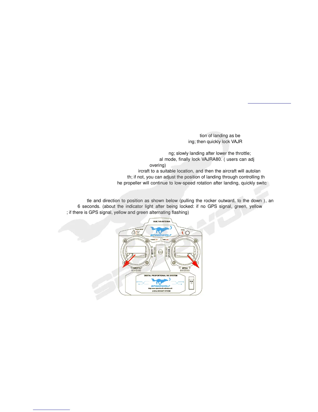 (2) GPS: adjust the aircraft to a suitable location, and then keep hovering; slowly landing after lower the throttle; make the throttle in