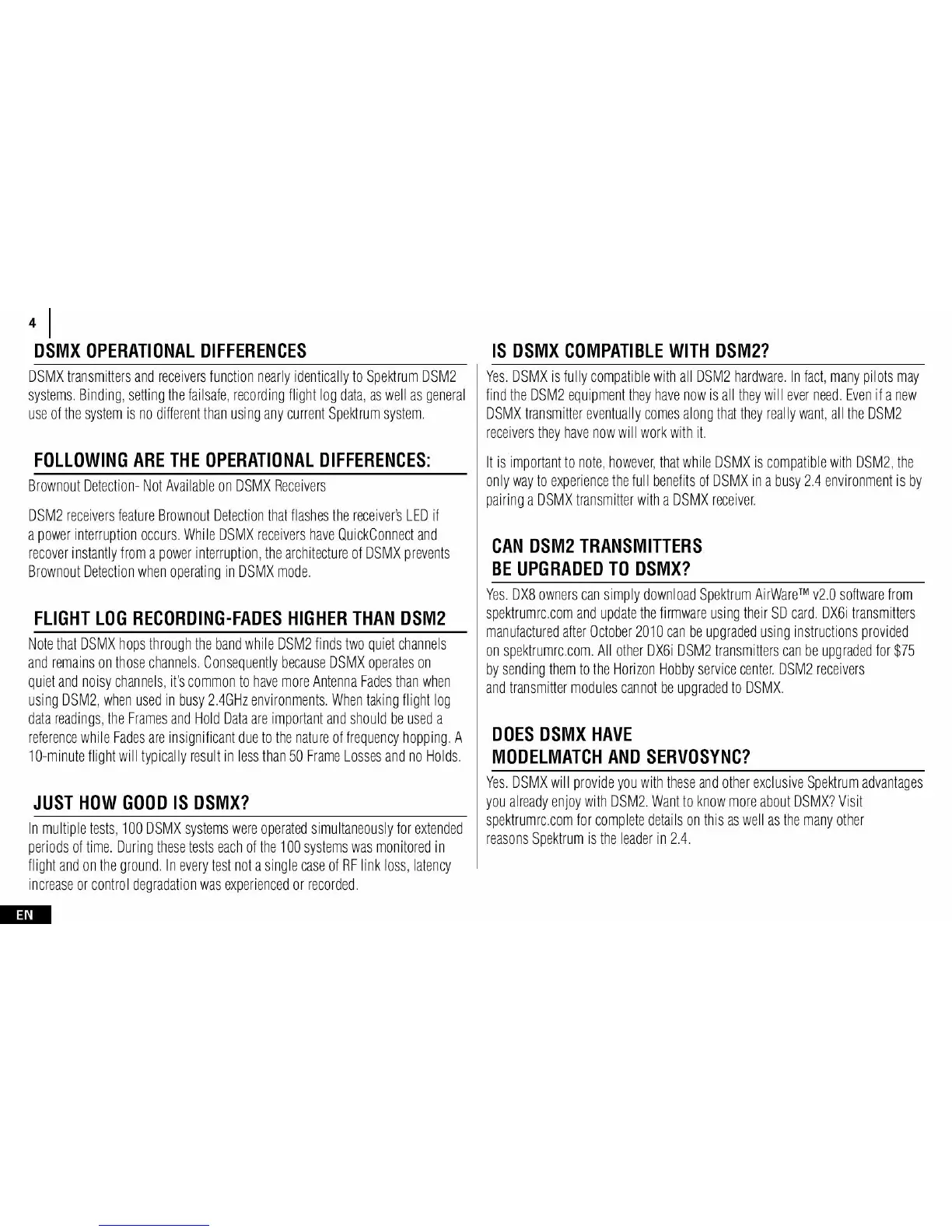 Spektrum DX 4e - DSMX Operational Differences and FAQ; Brownout Detection; Flight Log Recording; DSMX Compatibility and Upgrades