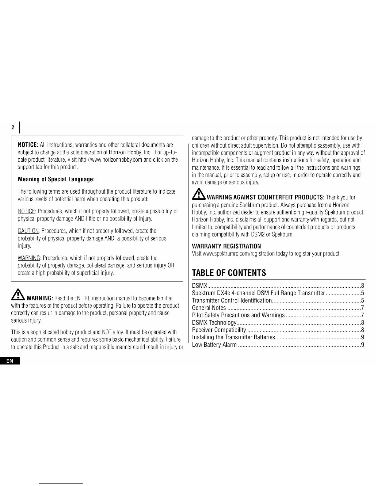 Spektrum DX 4e - Understanding Special Language; NOTICE Definitions; CAUTION Definitions; WARNING Definitions