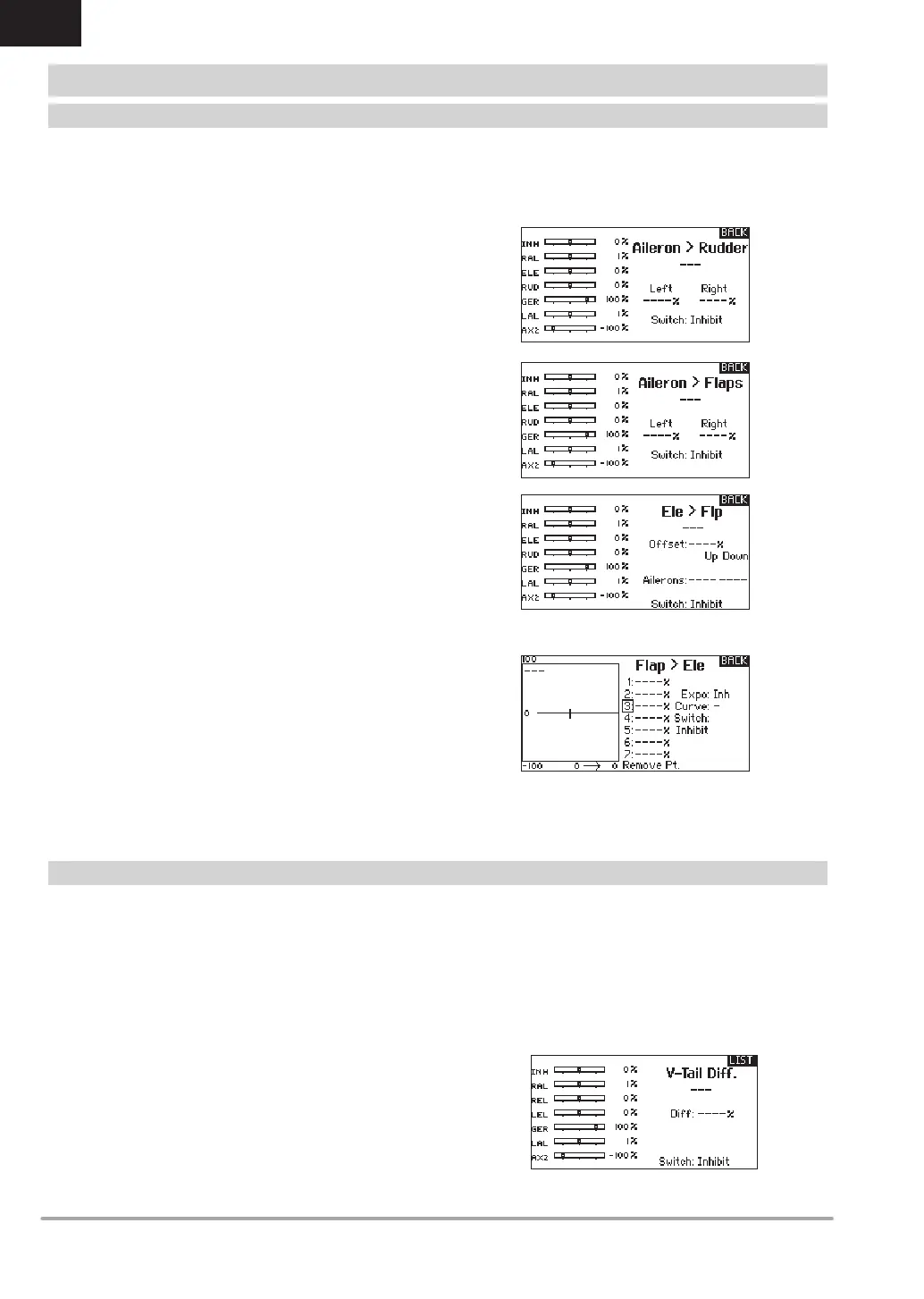For each of these mixes, you can program each fl ight mode with different mix values or at 0% if no mix is desired for that specifi c fl ight