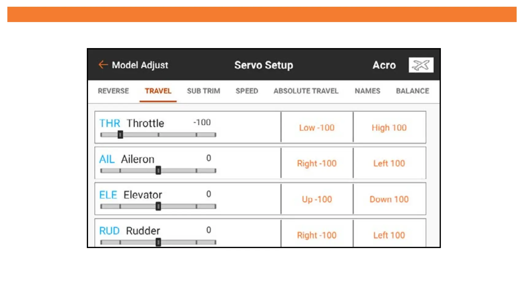The Travel menu sets the travel or endpoints of the servo arm movement.