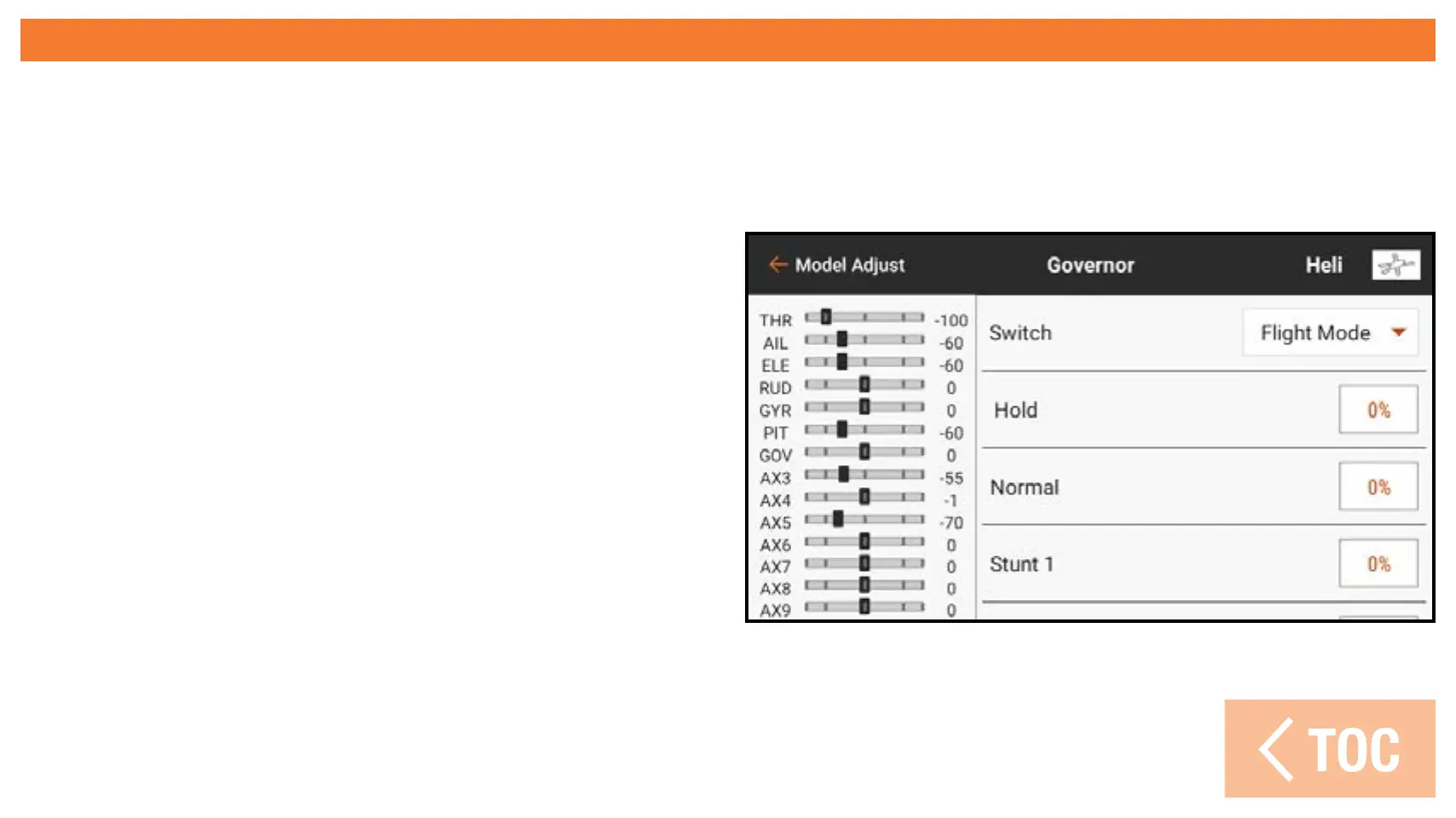 The Governor menu is available when the model type is set to Helicopter. Governors