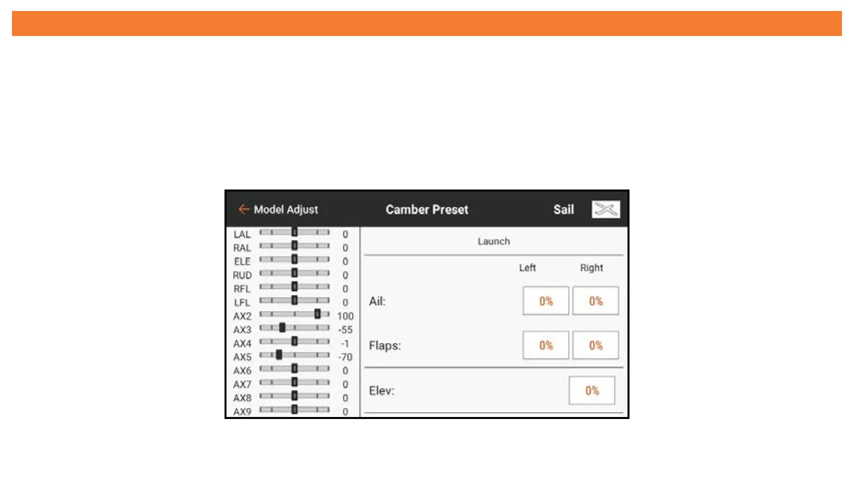 The Camber Preset function allows for programming of the ailerons, flaps (if assigned),