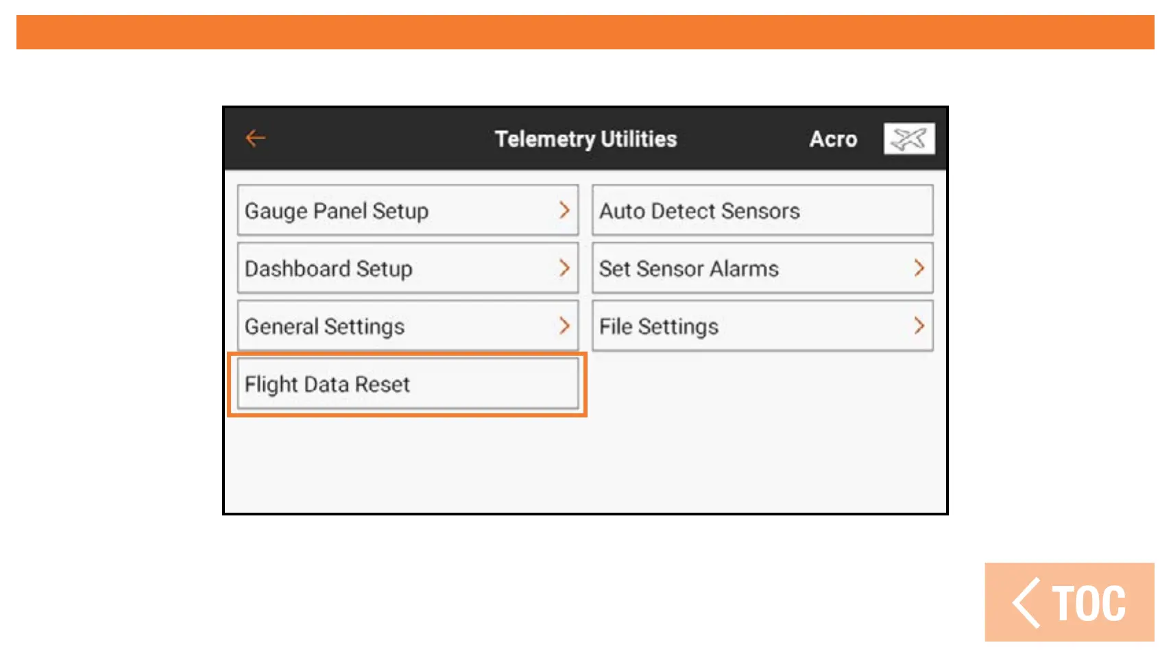 Touch the Flight Data Reset tab to reset all of the telemetry values to their initial values.