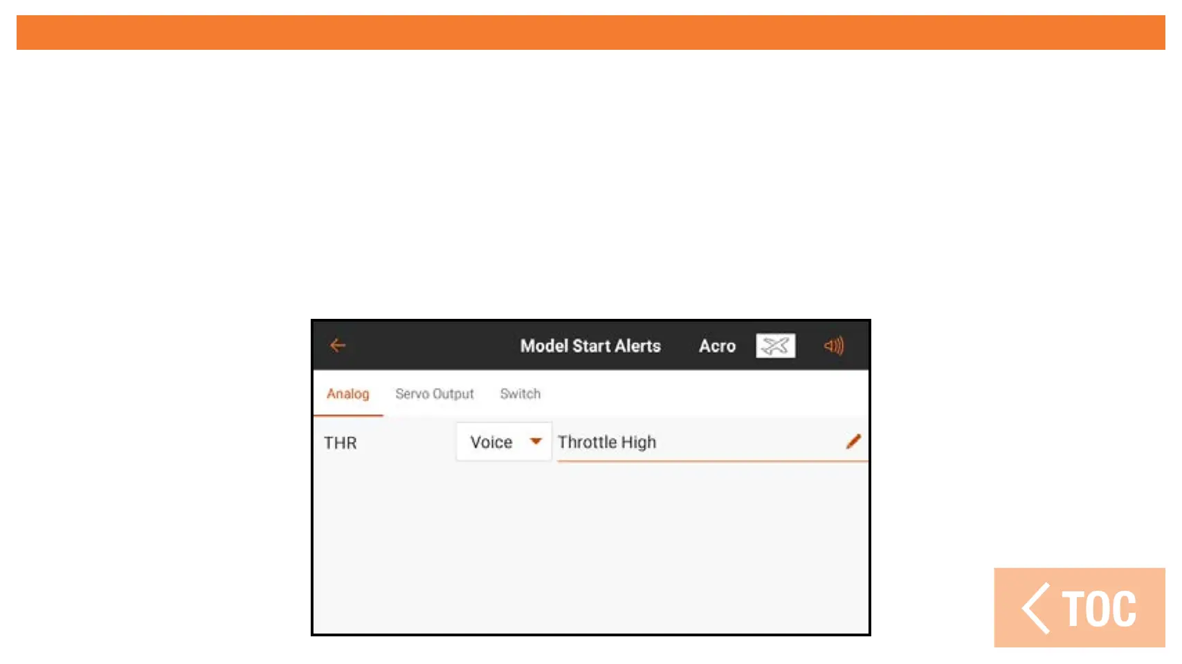 The Model Start Alerts menu includes three options: STICK INPUT, SERVO OUTPUT