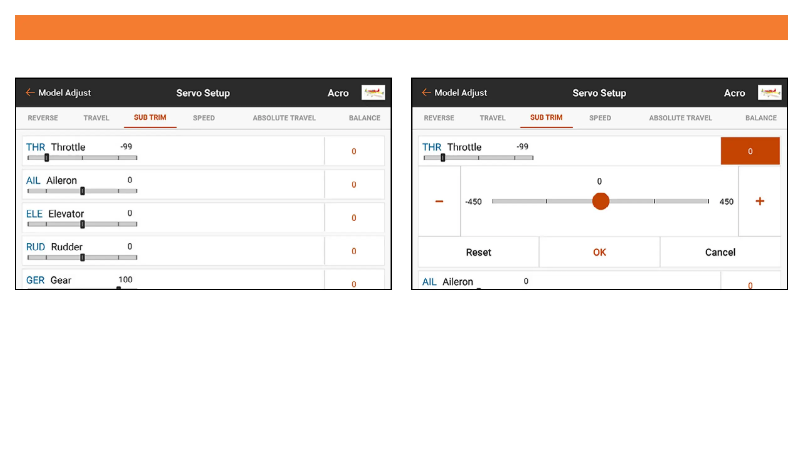 The Sub Trim menu adjusts the servo travel center point.
