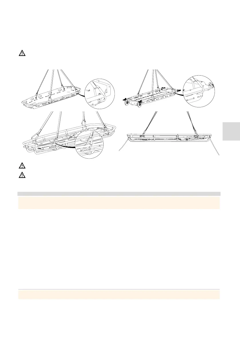 • Per il sollevamento e abbassamento orizzontale le barelle basket sono dotate di 4 occhielli o 4 alloggiamenti che forniscono i punti di ancoraggio per le imbracature con i