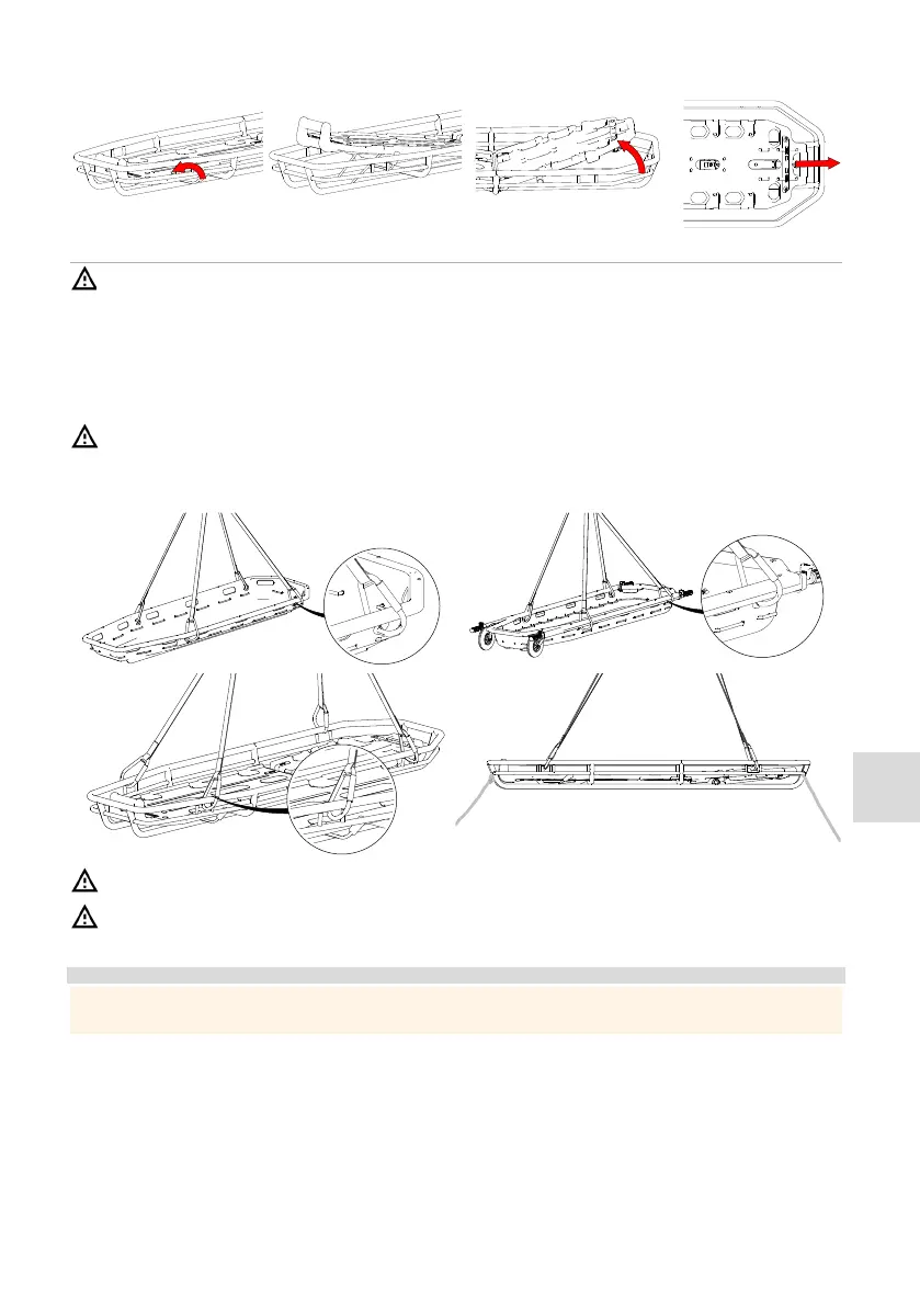 • Para la elevación y el descenso horizontal, las camillas tipo cesta están equipadas con 4 ojales o 4 alojamientos que proporcionan los puntos de anclaje para las eslingas con