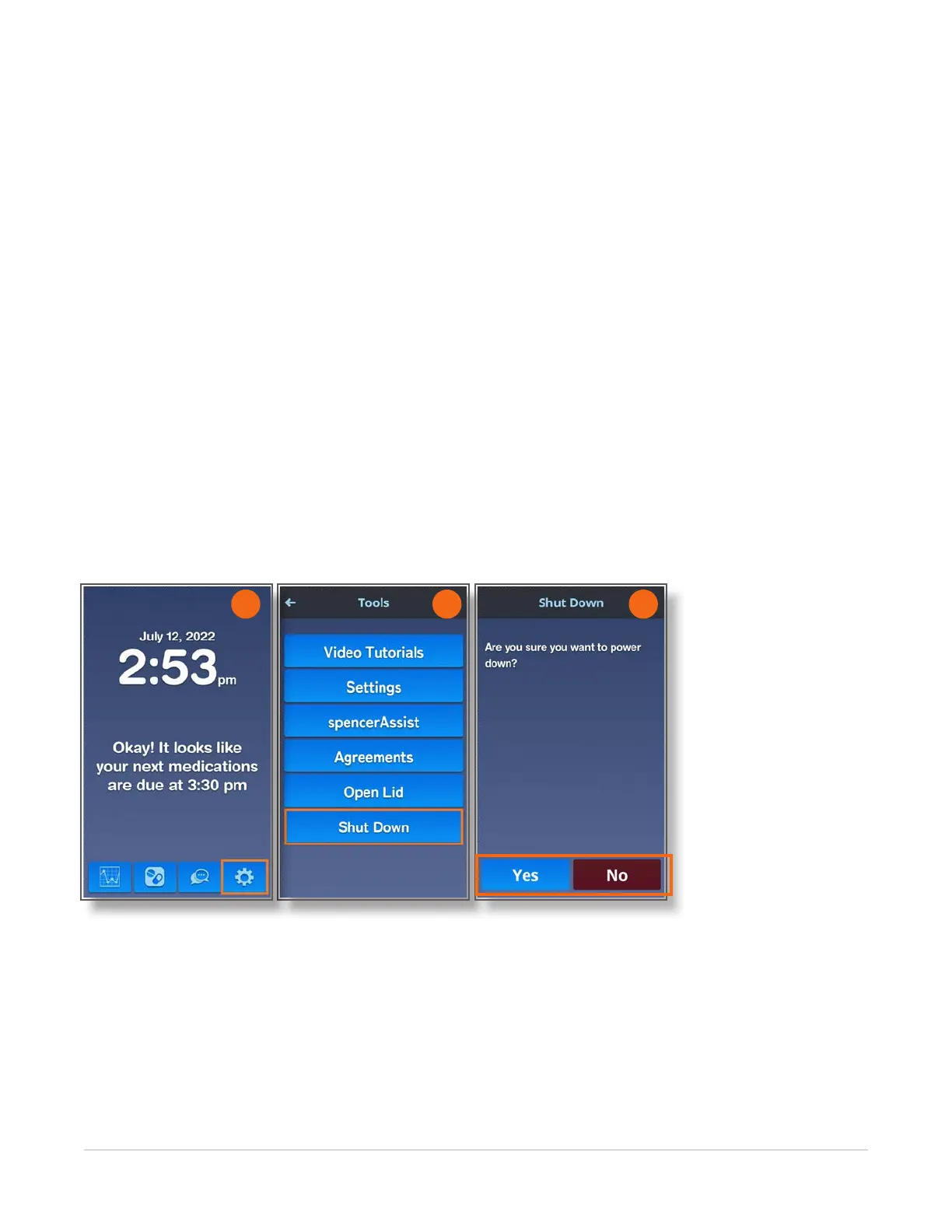 Touch the No button to return to the Tools screen without turning off spencer.