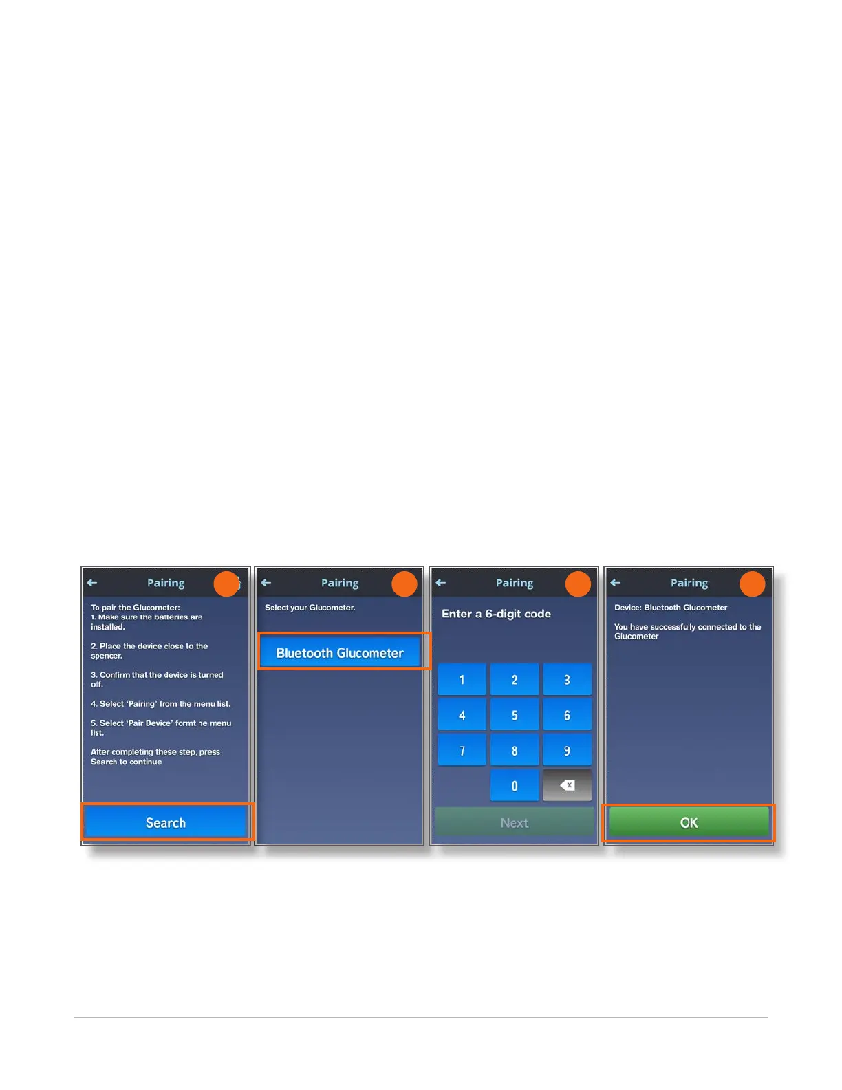 7. Enter the six-digit code displayed on your glucomenter into the Pairing screen and touch the Next