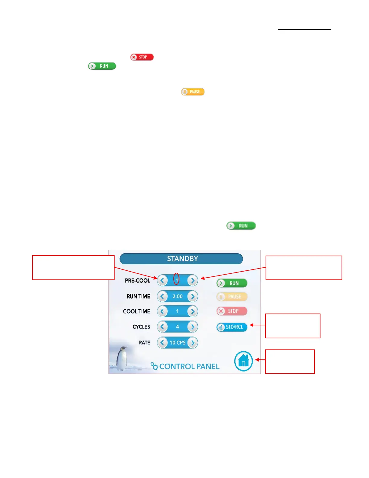 To pause during a grinding program, touch the button. The RUN will hold the settings at