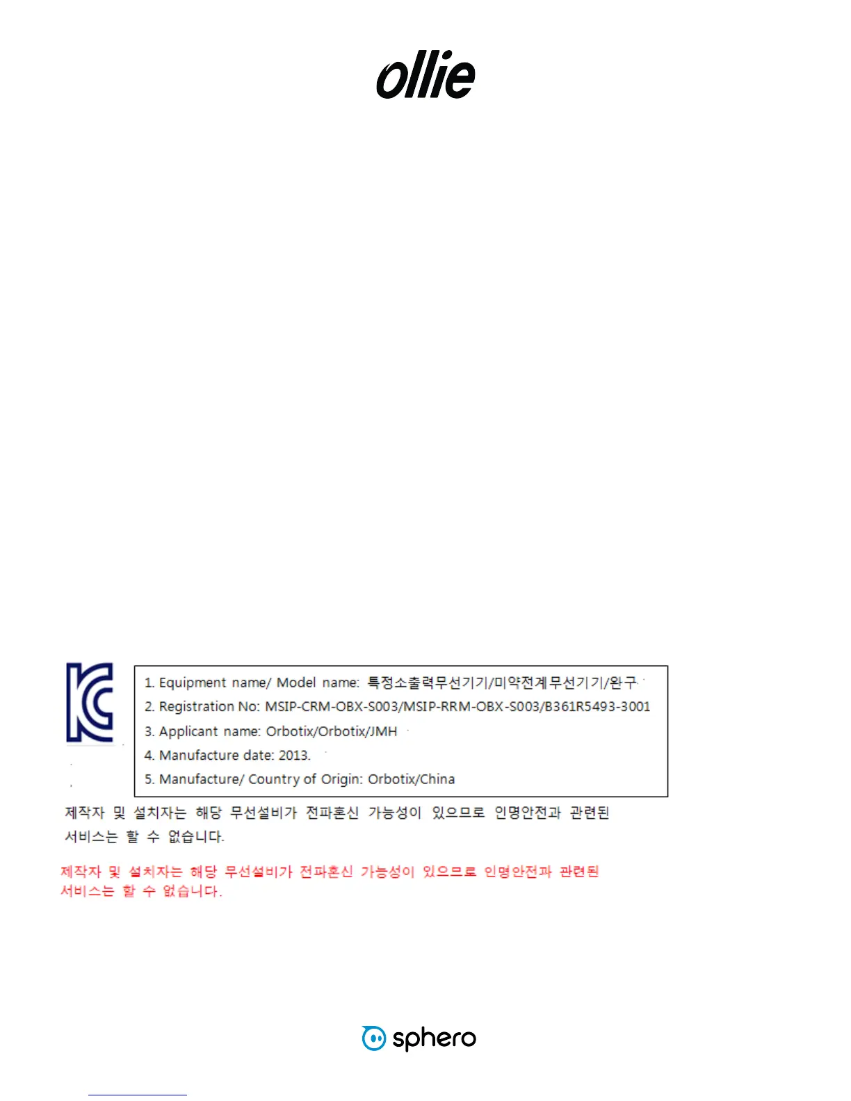 IMPORTANT! Changes or modifications not expressly approved by Orbotix, Inc. dba Ollie could void the user’s authority to operate the equipment.